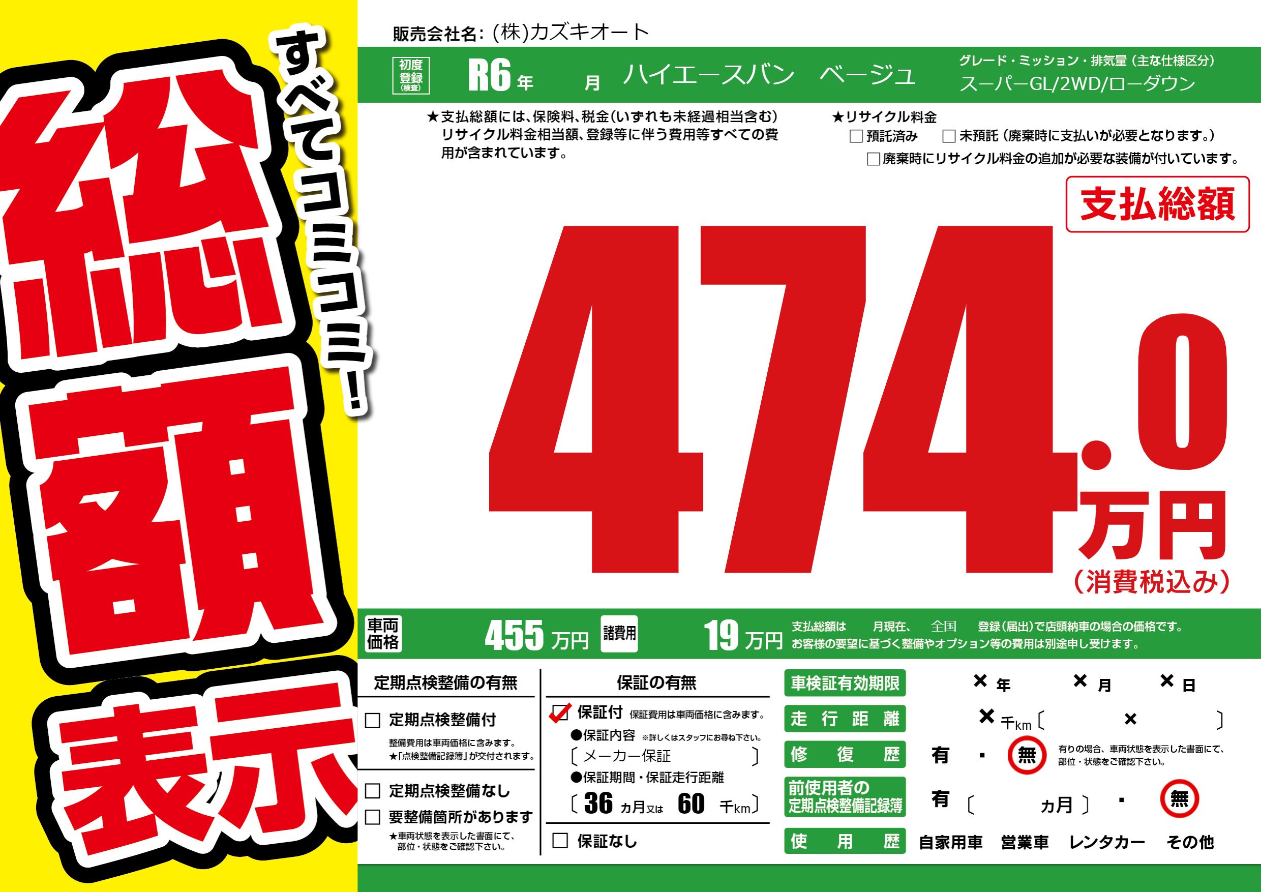 | 車名 | ハイエースバン ベージュ | グレード ミッション 排気量 |