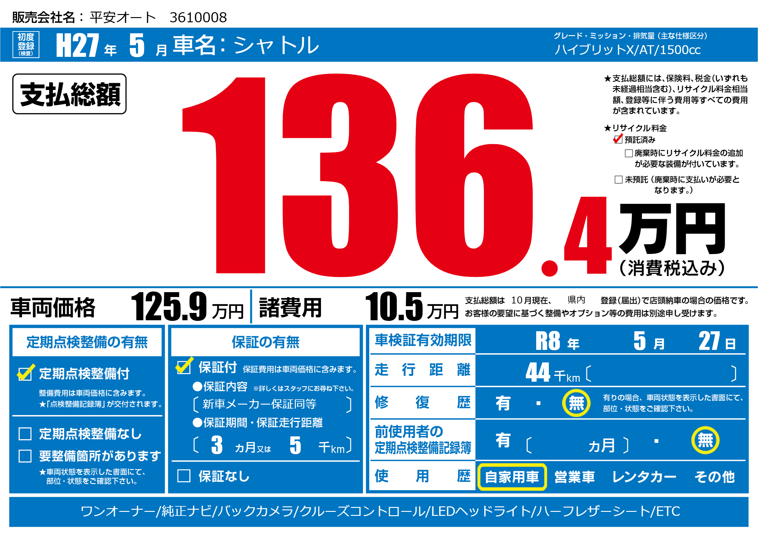 なし | 車検制限 | R8年5月27月 |