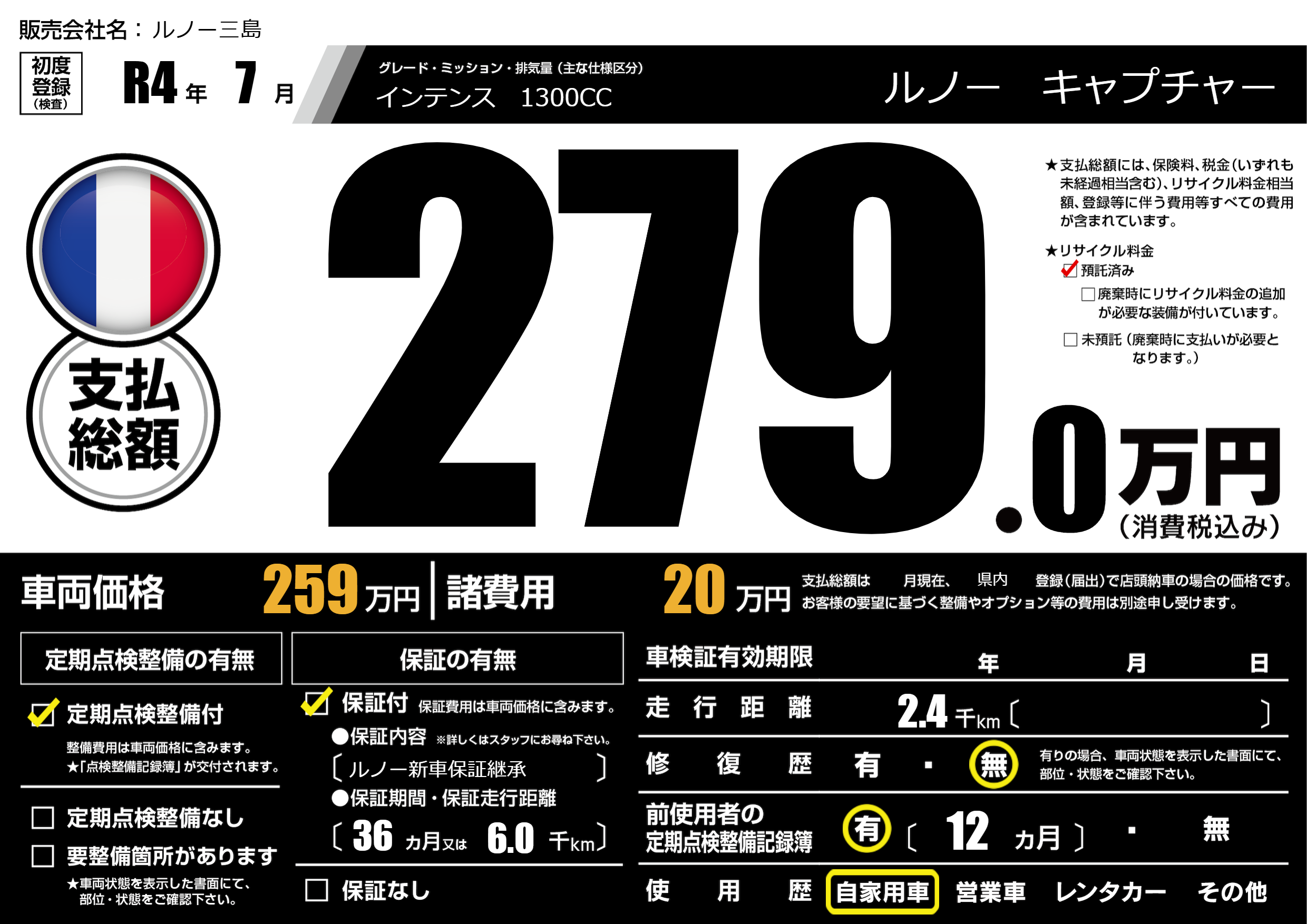 | 車名 | ルノー キャプチャー | グレード ミッション 排気量 |