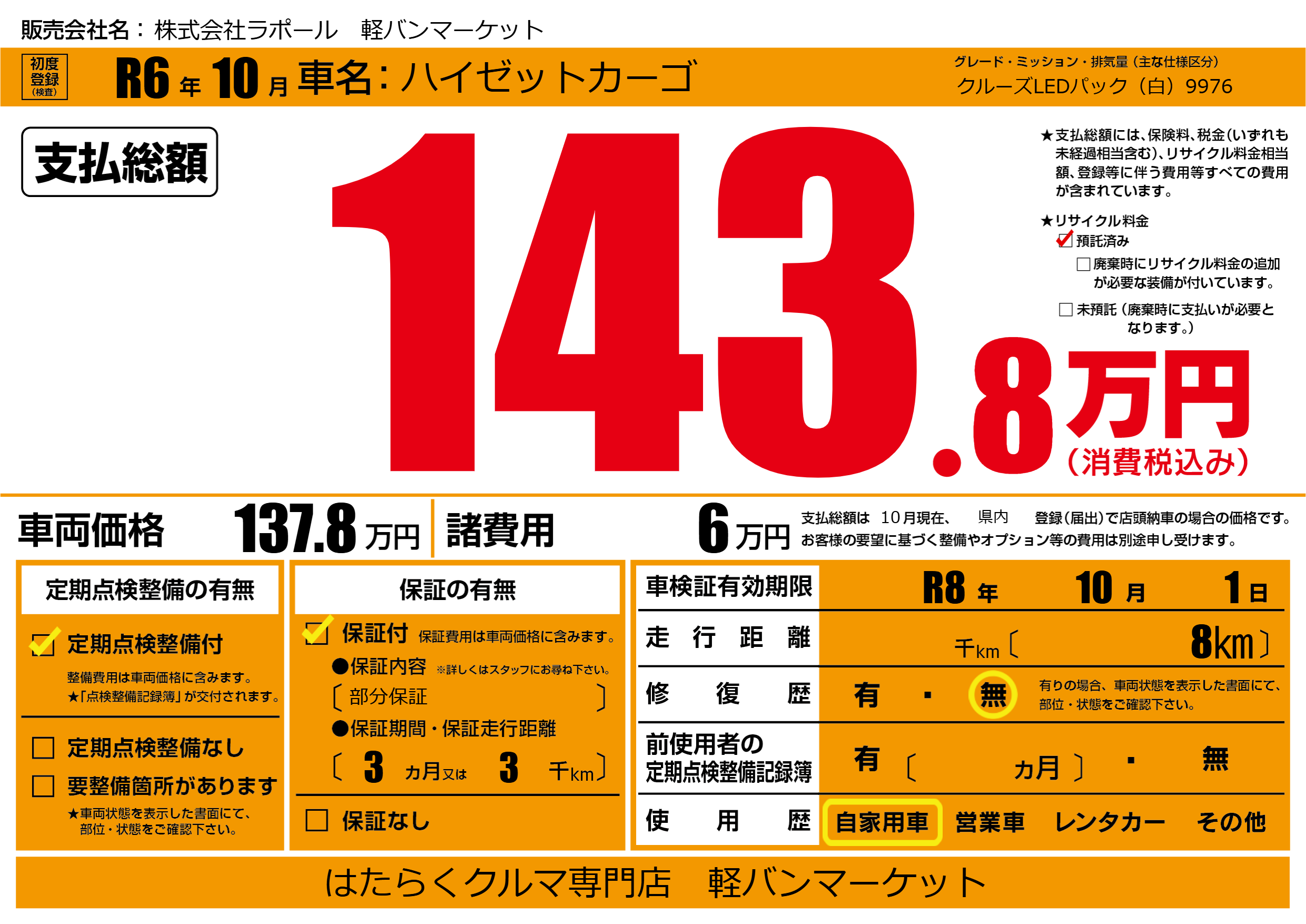 | 車名 | ハイゼットカーゴ | グレード ミッション 排気量 |