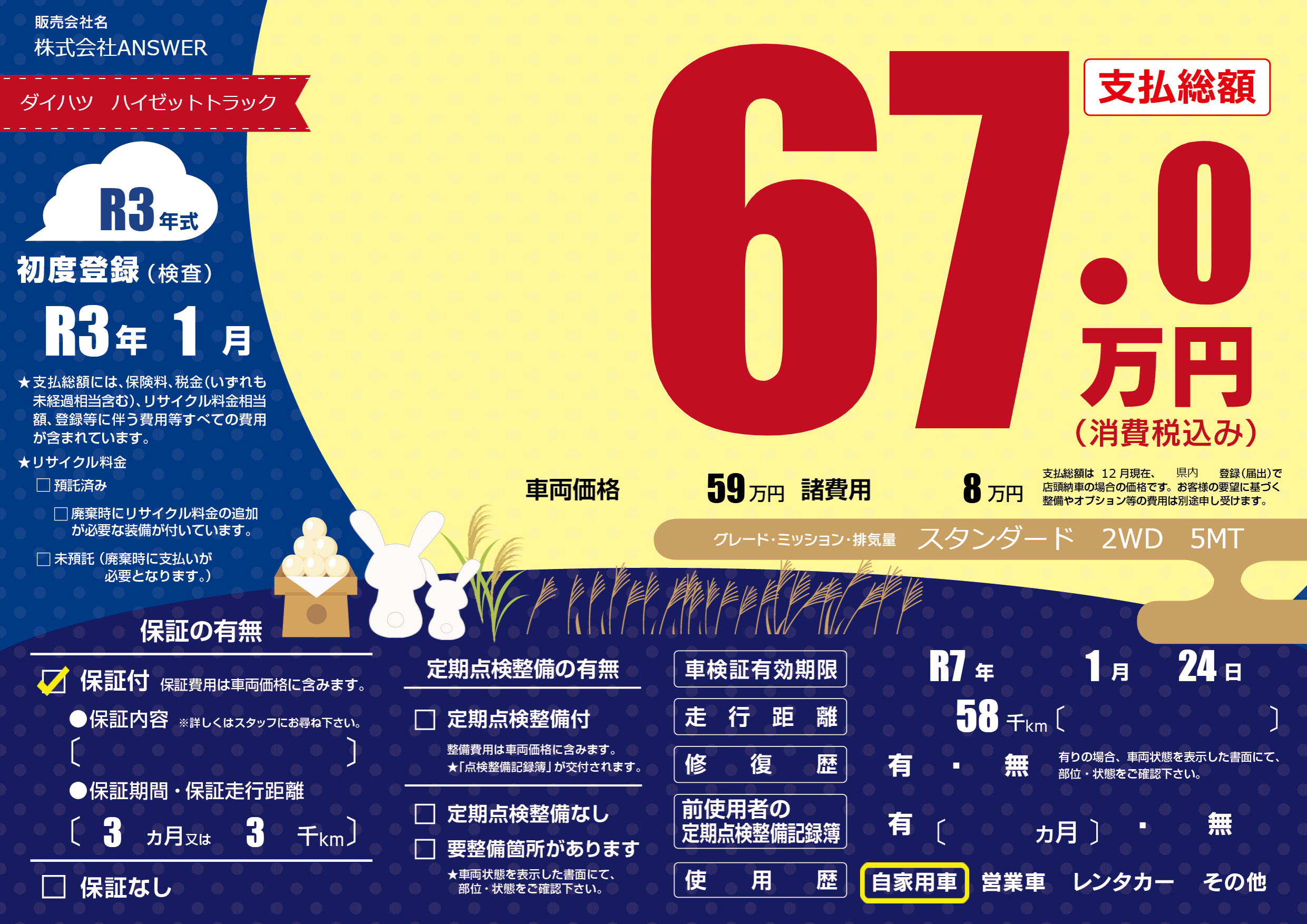保証付き 保証内容(---) 3ヶ月または(3)千kmまで |