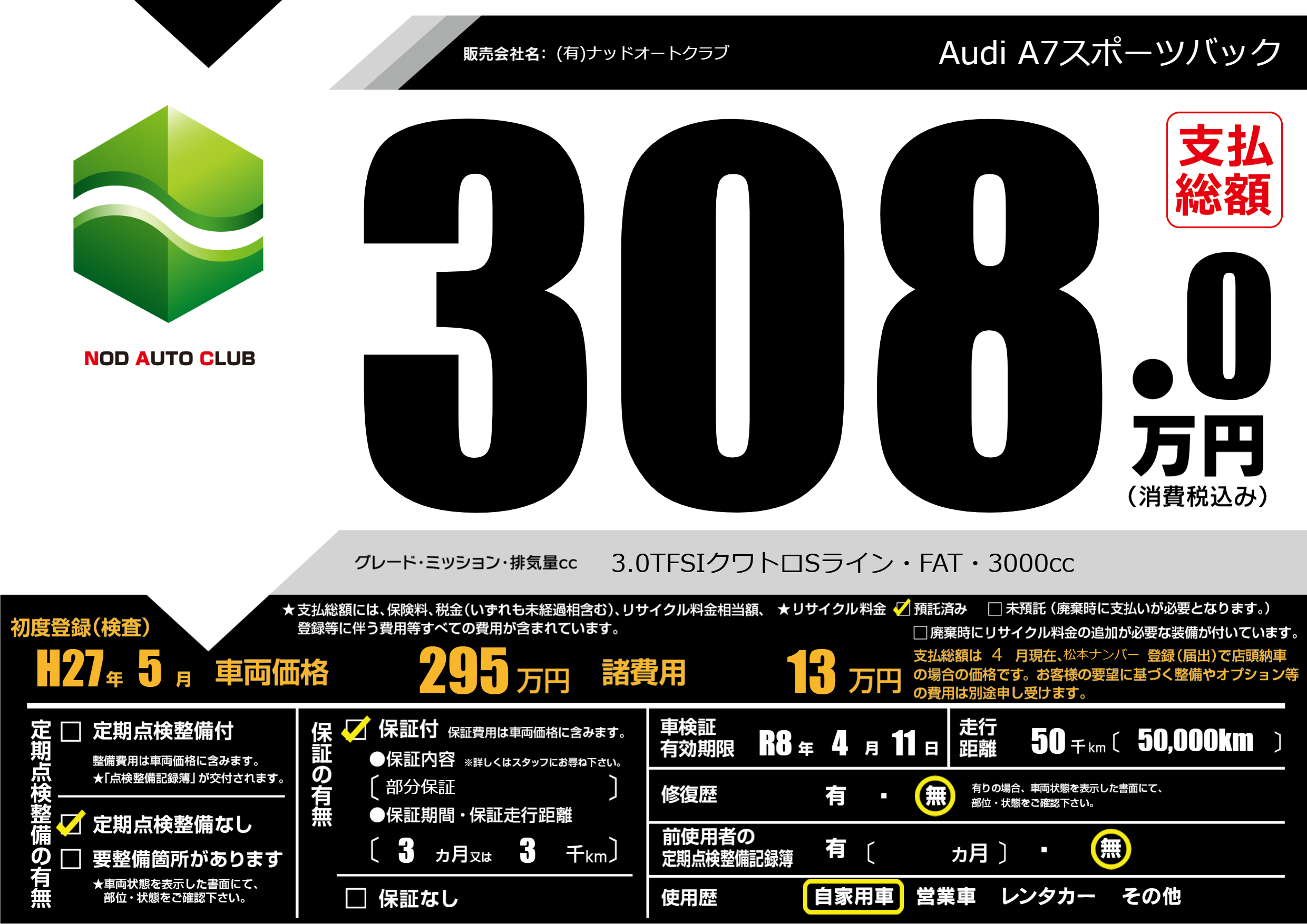 | 車名 | Audi A7スポーツバック | グレード ミッション 排気量 |