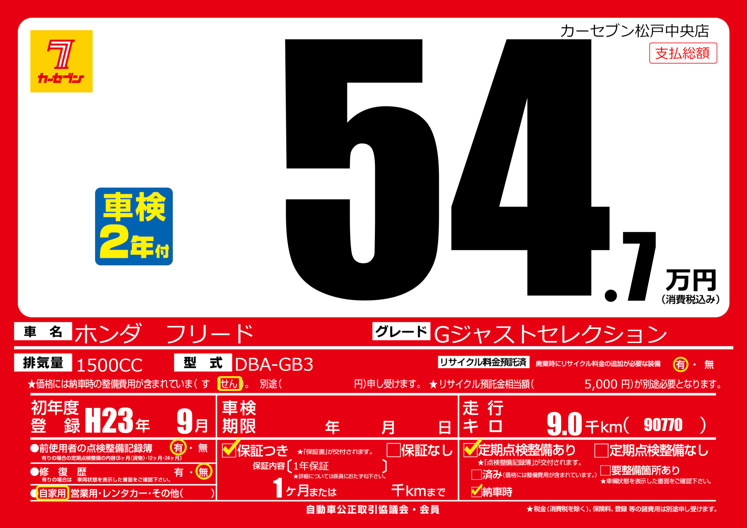 | 車名 | ホンダ フリード | グレード ミッション 排気量 |