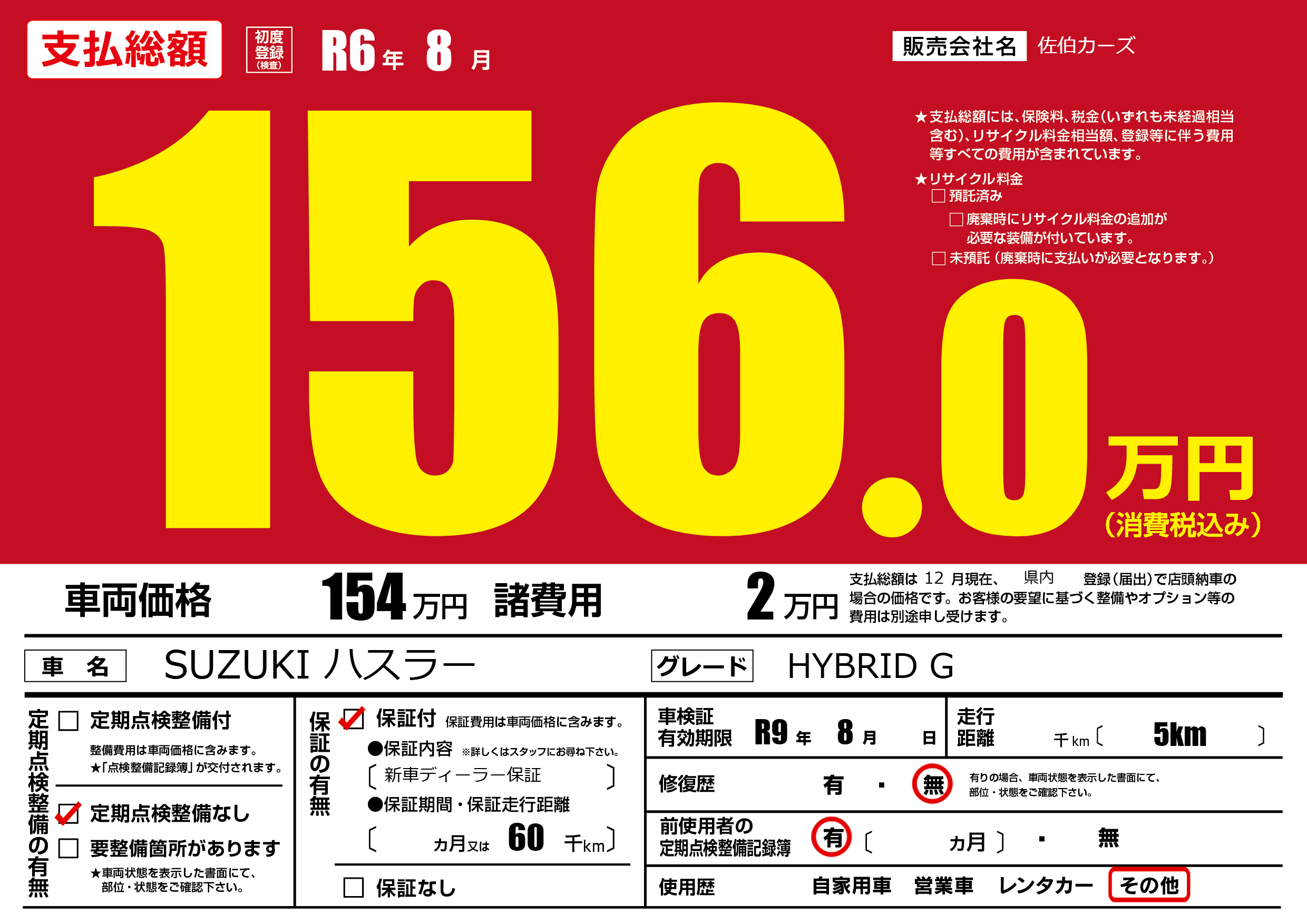 | 走行キロ | - | 初年度登録 | R6年8月 |