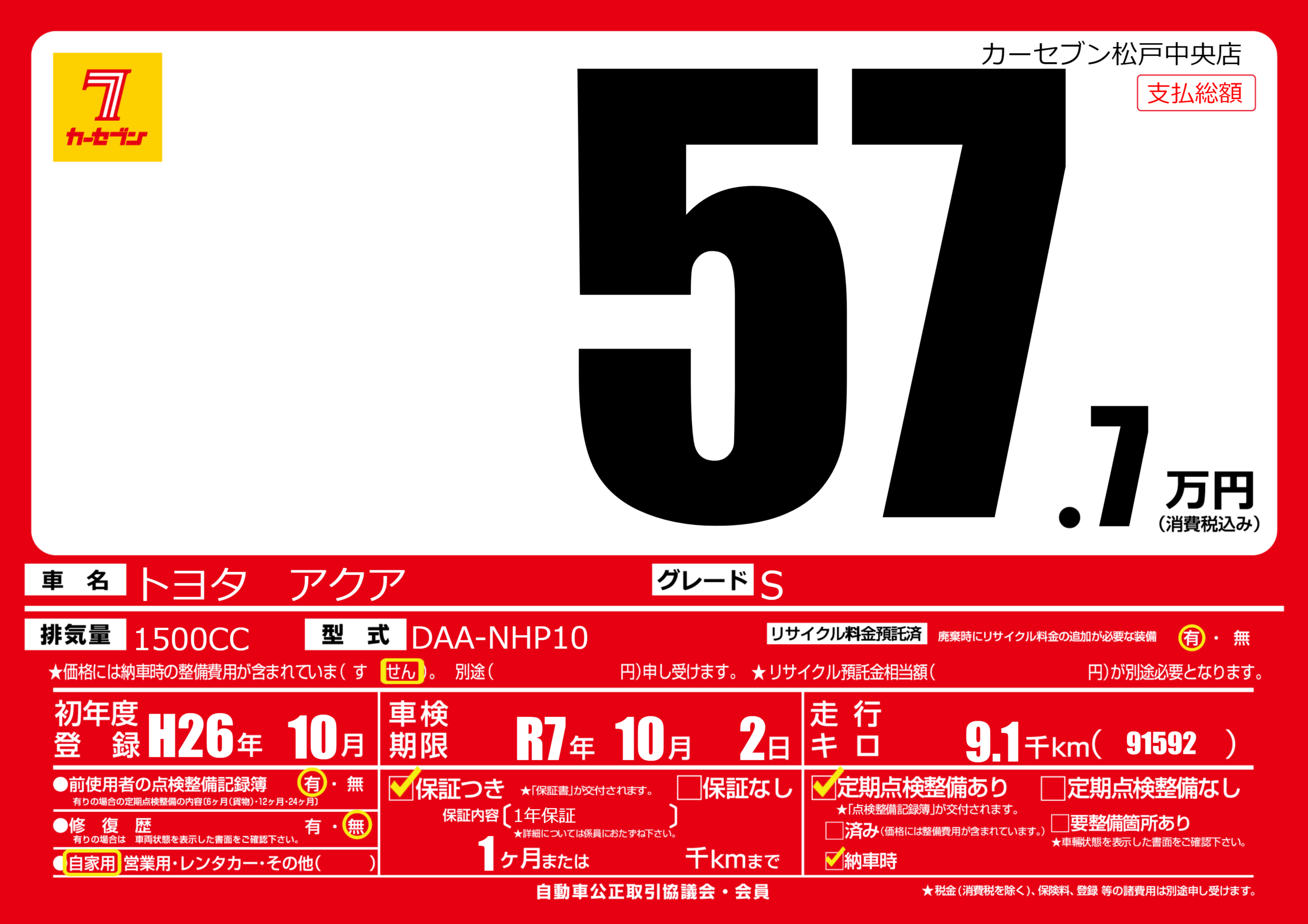 なし | 車検制限 | R7年10月2月 |