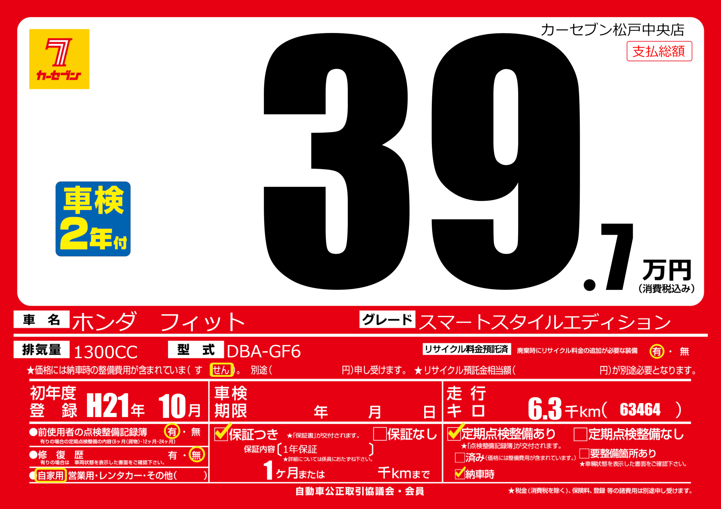 | 車名 | ホンダ フィット | グレード ミッション 排気量 |