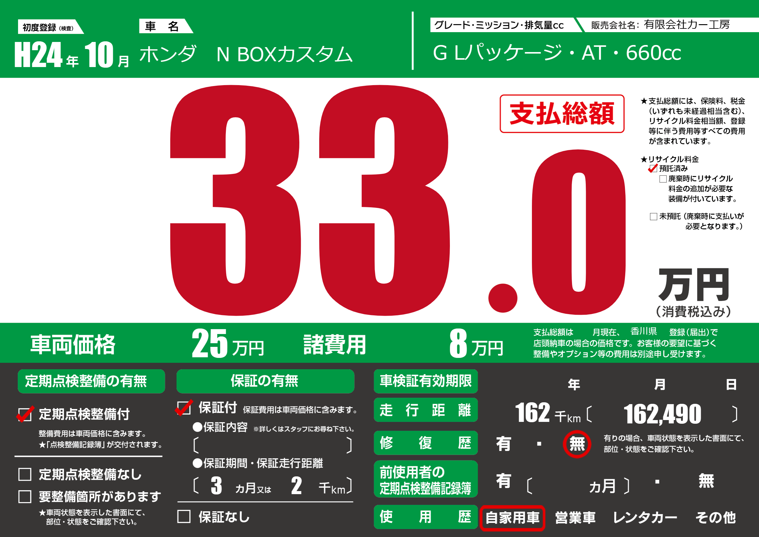 | 車名 | ホンダ N BOXカスタム | グレード ミッション 排気量 |