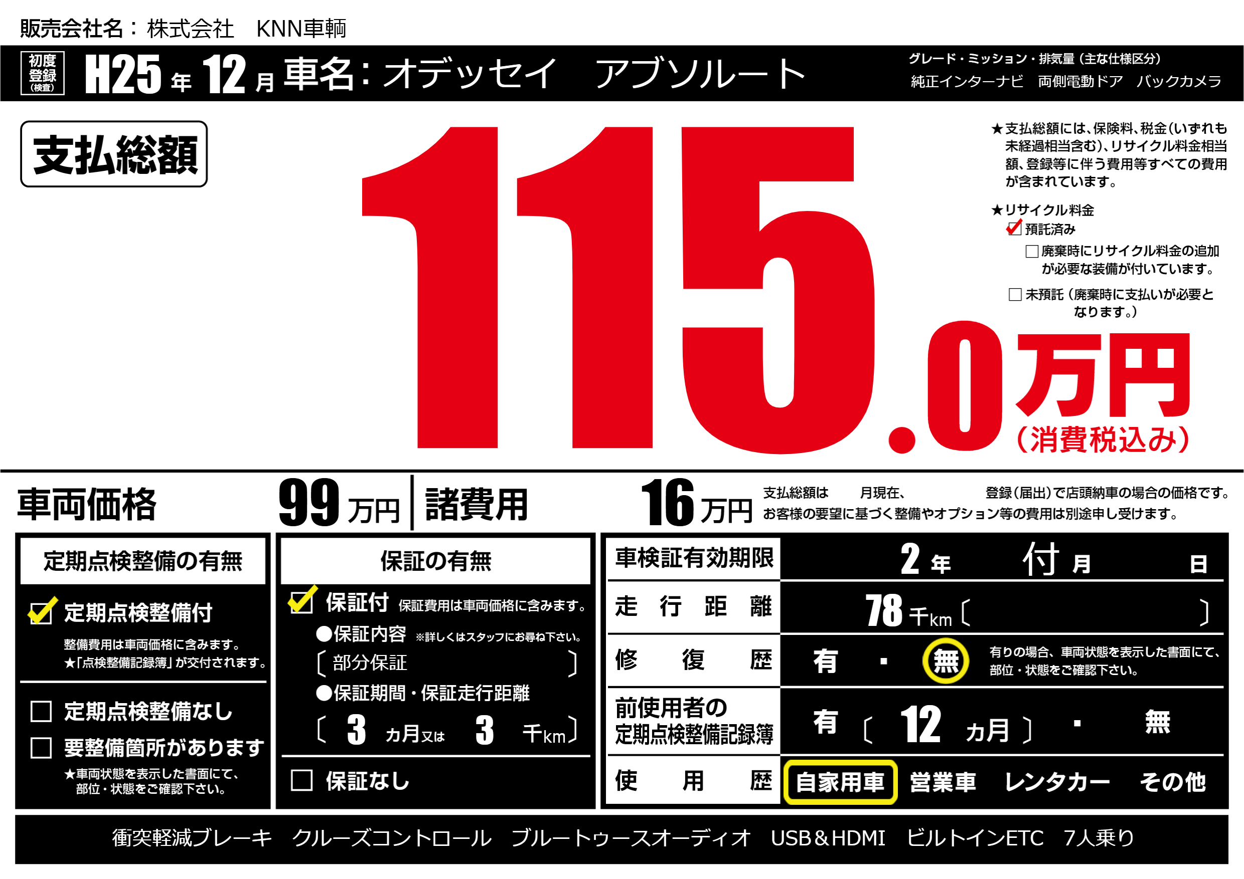 | 走行キロ | 7.8万km | 初年度登録 | H25年12月 |