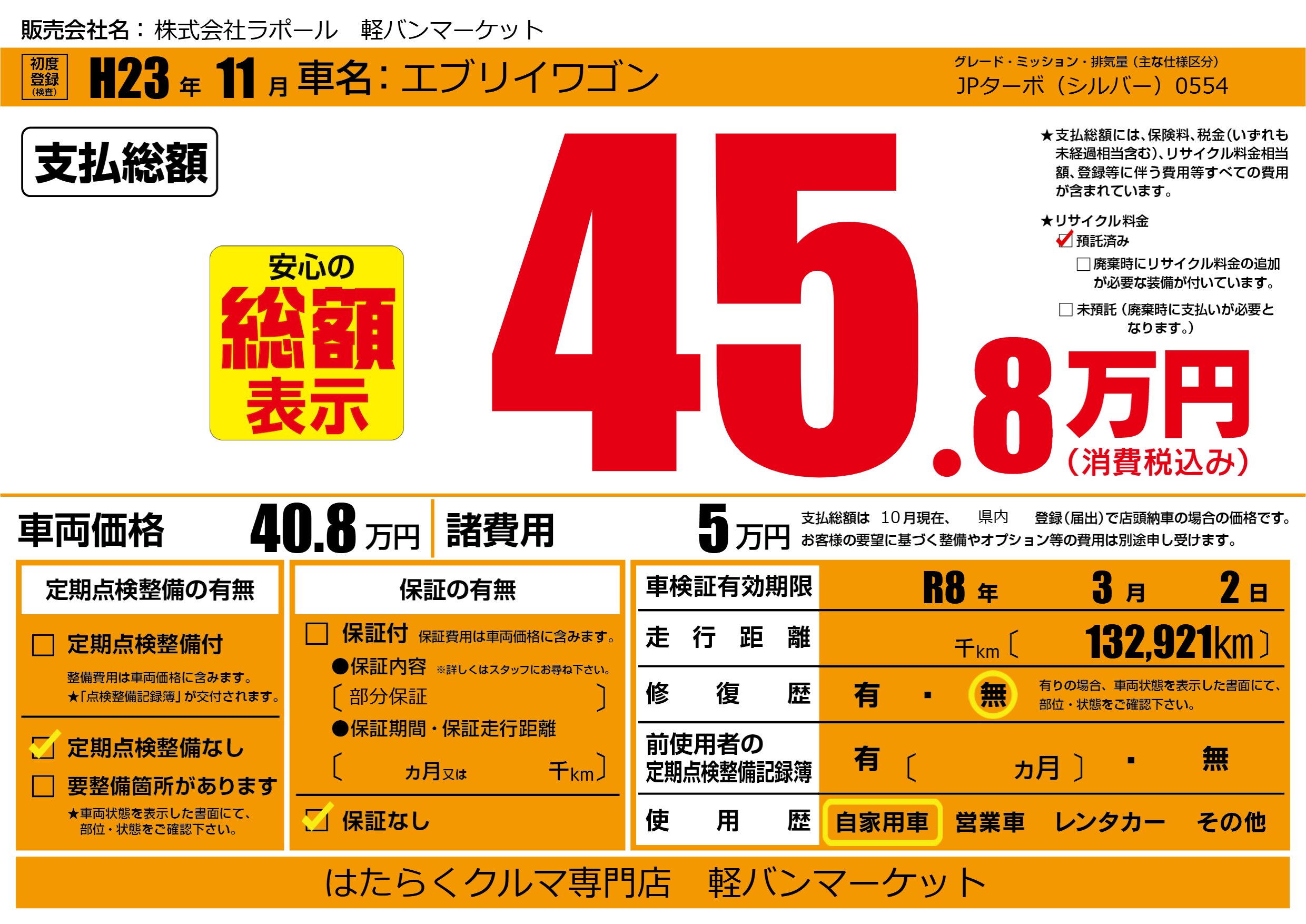 | 車名 | エブリイワゴン | グレード ミッション 排気量 |