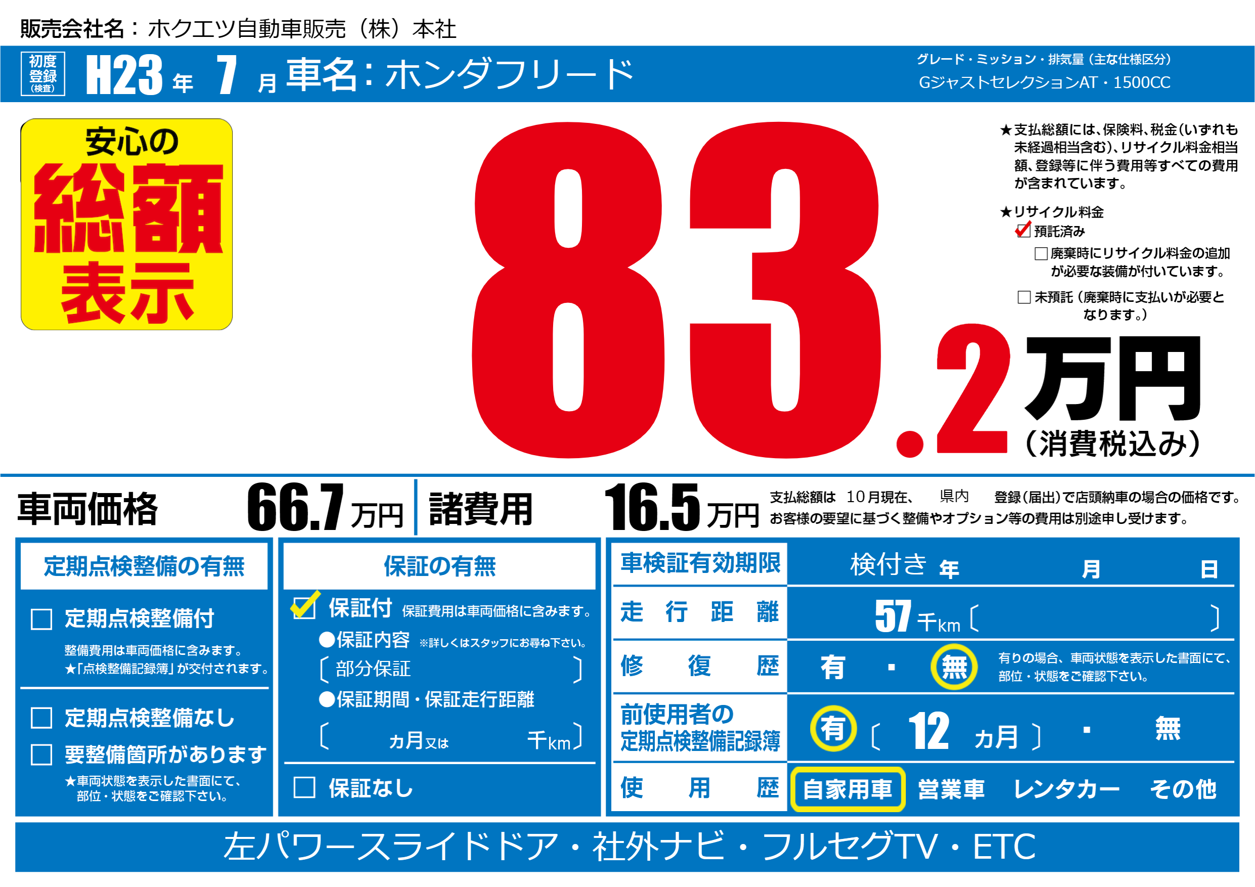 | 車名 | ホンダフリード | グレード ミッション 排気量 |