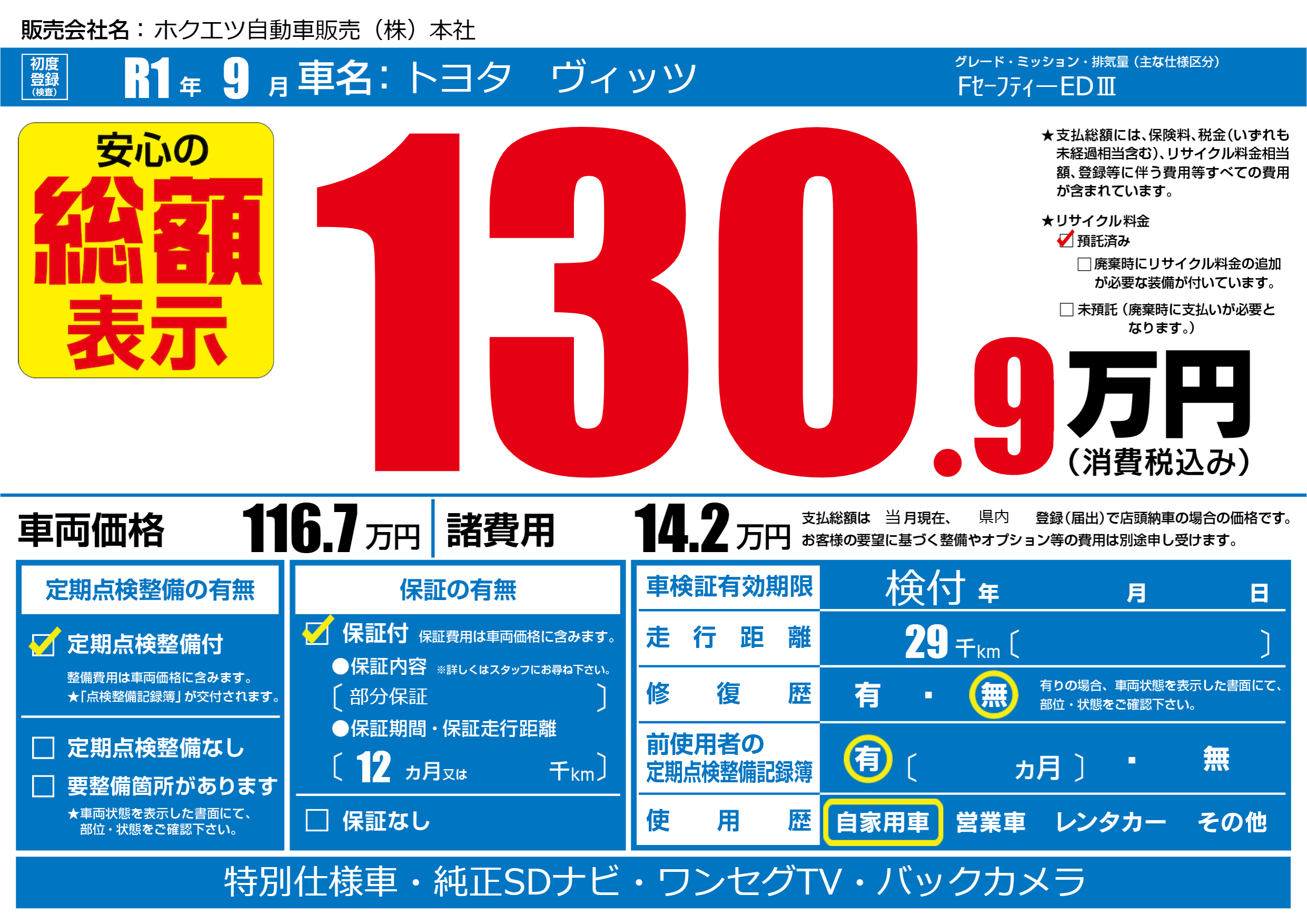 | 車名 | トヨタ ヴィッツ | グレード ミッション 排気量 |