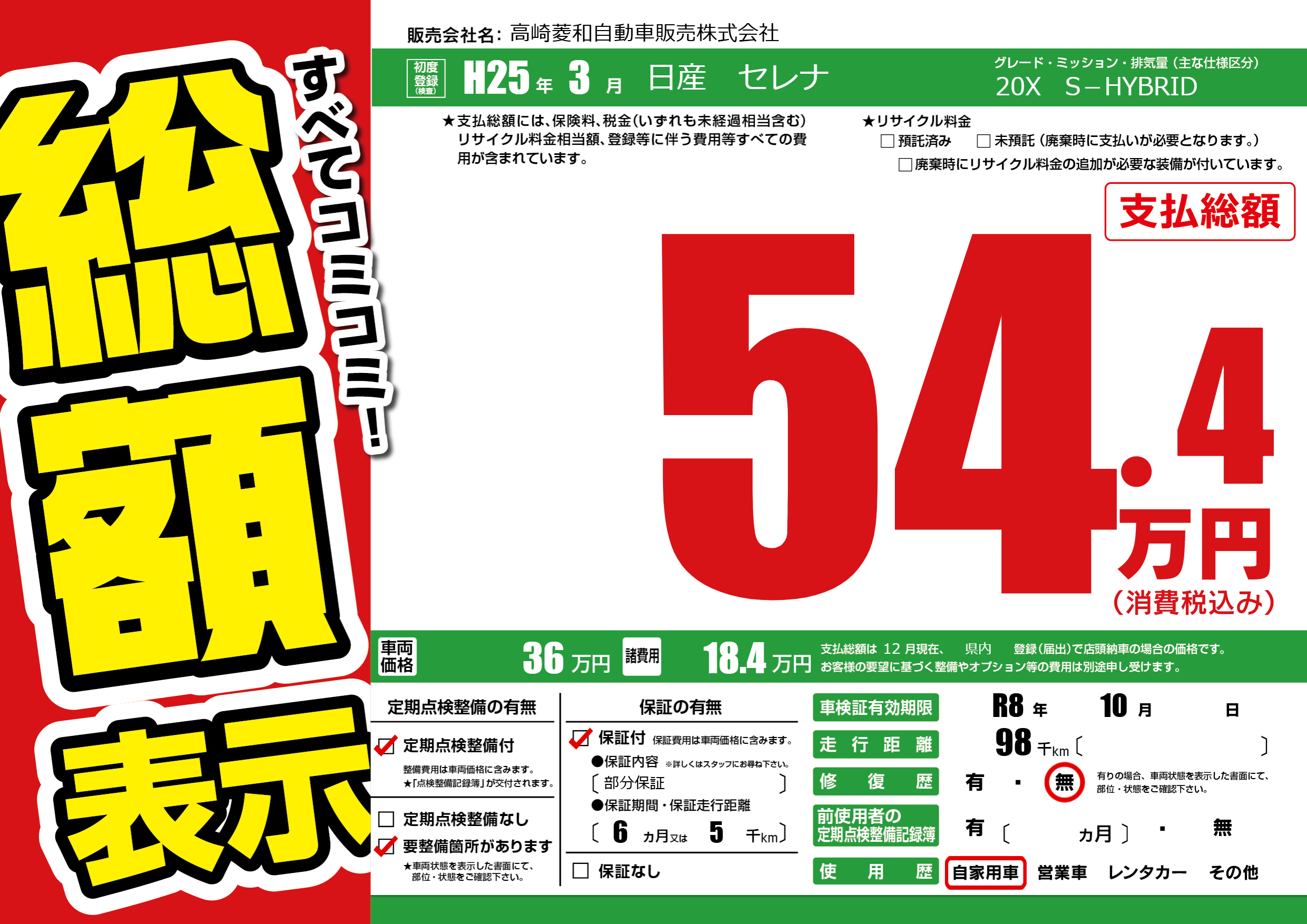 | 車名 | 日産 セレナ | グレード ミッション 排気量 |