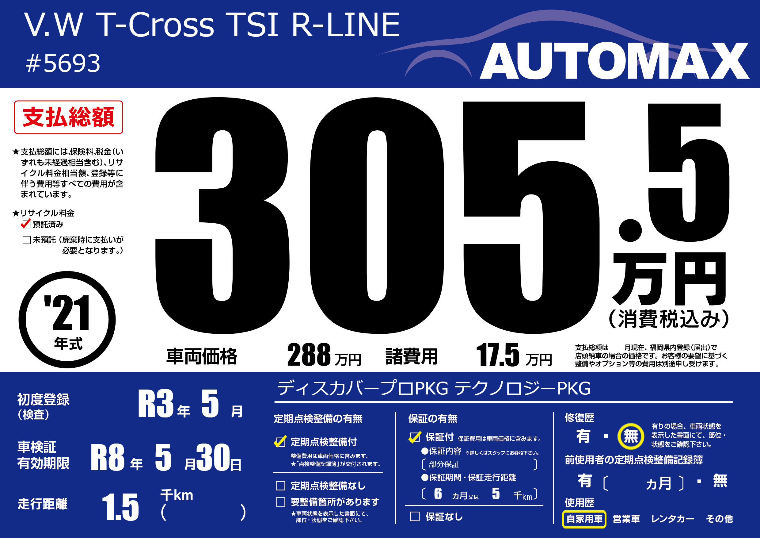 | 車名 | V.W T-Cross TSI R-LINE | グレード ミッション 排気量 |