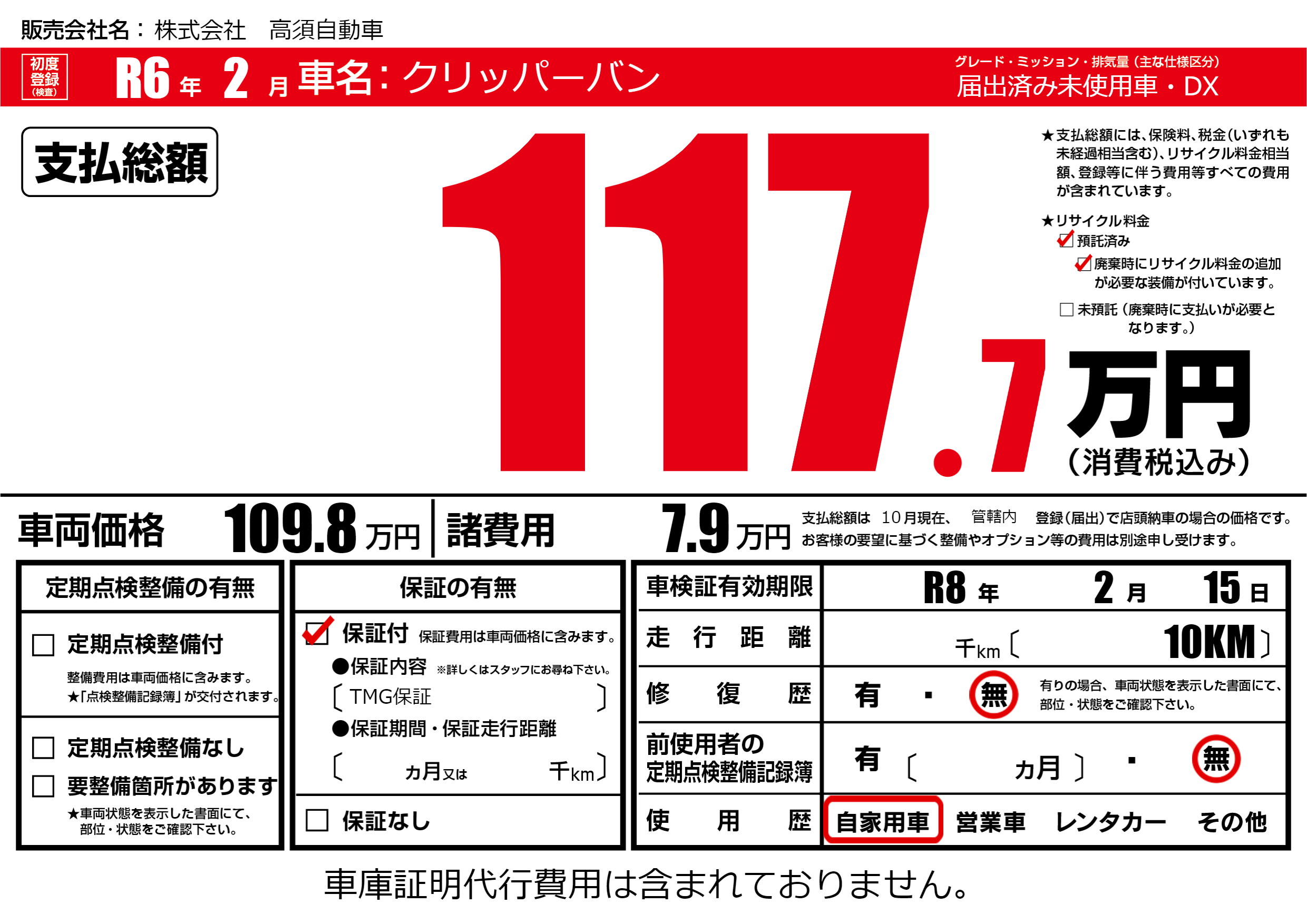 保証付き 保証内容(TMG保証) ---ヶ月または()千kmまで |