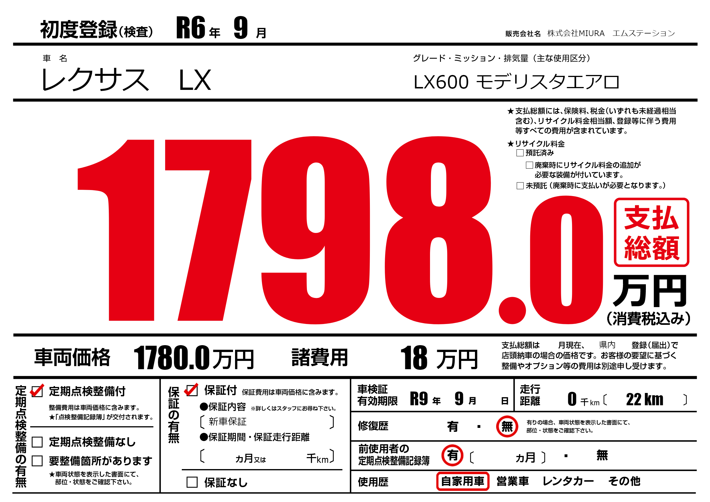 なし | 車検制限 | R9年9月---月 |