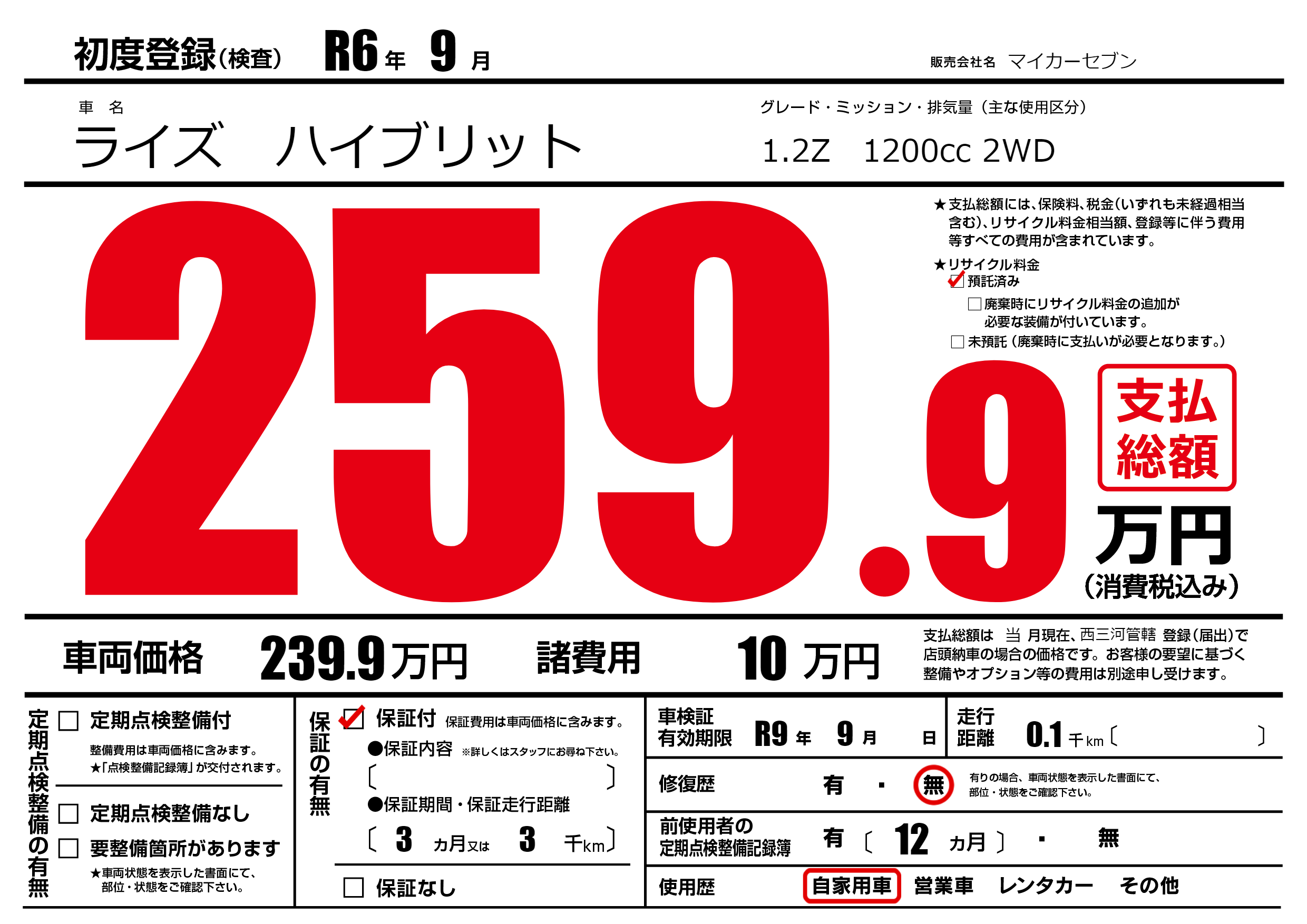 | 車名 | ライズ ハイブリット | グレード ミッション 排気量 |