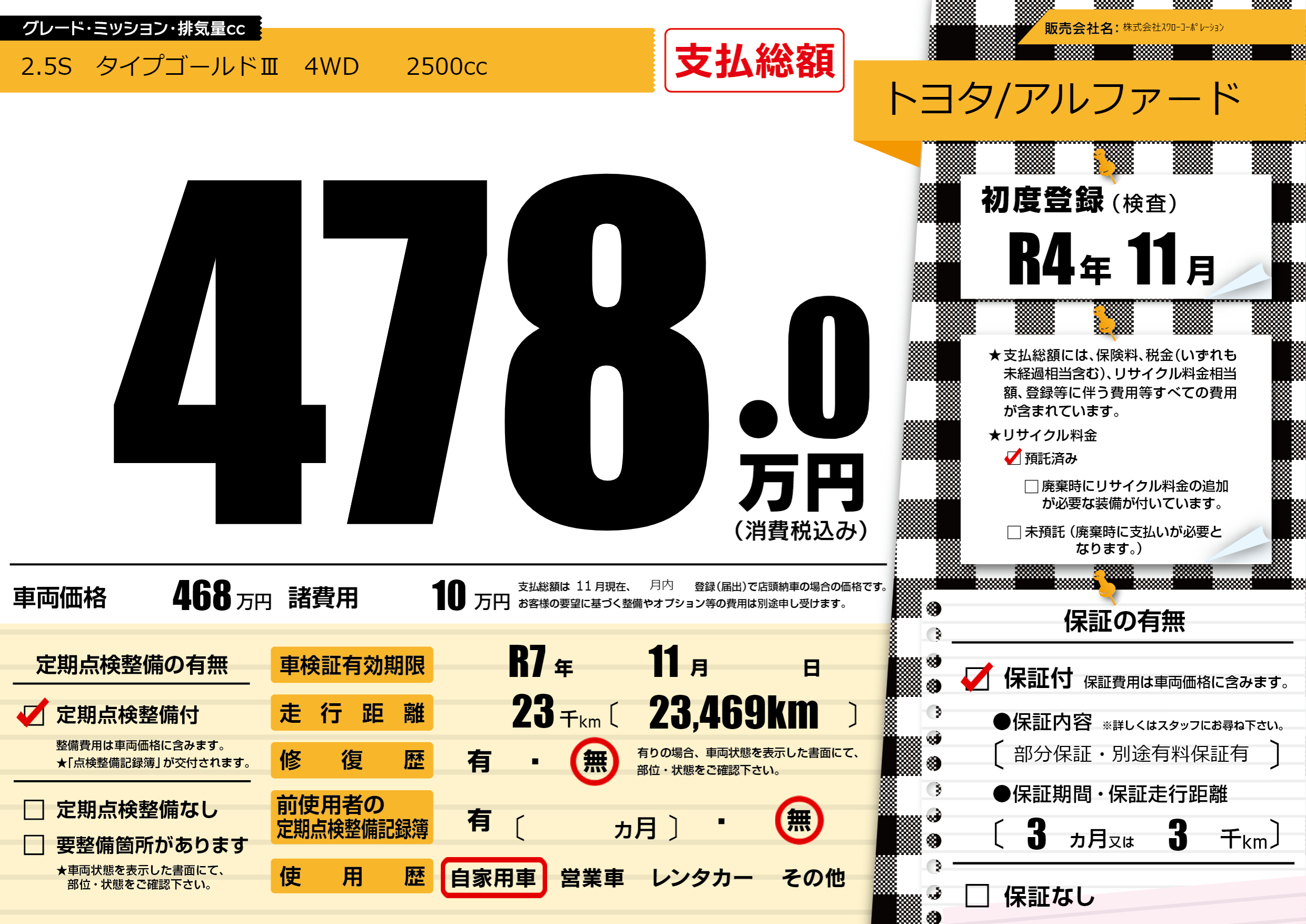 | 車名 | トヨタ/アルファード | グレード ミッション 排気量 |