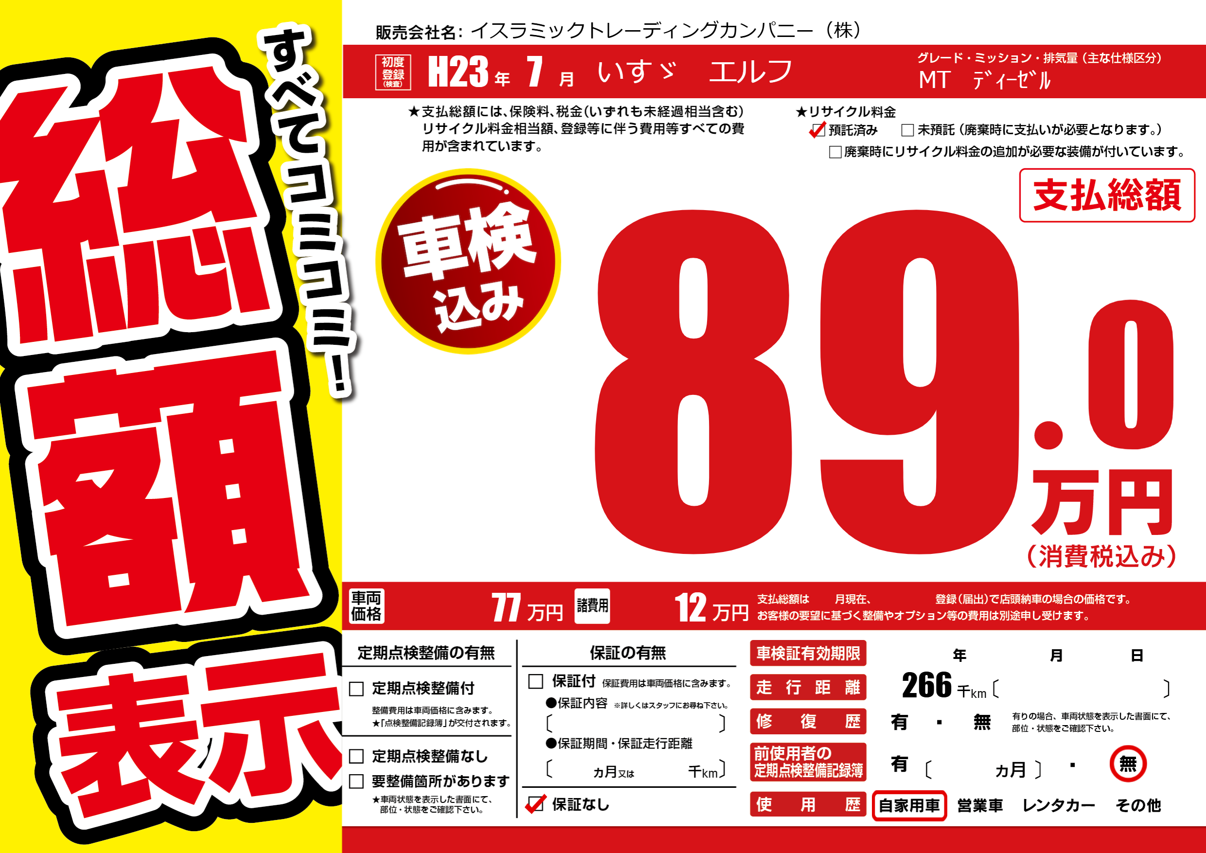 | 車名 | いすゞ エルフ | グレード ミッション 排気量 |