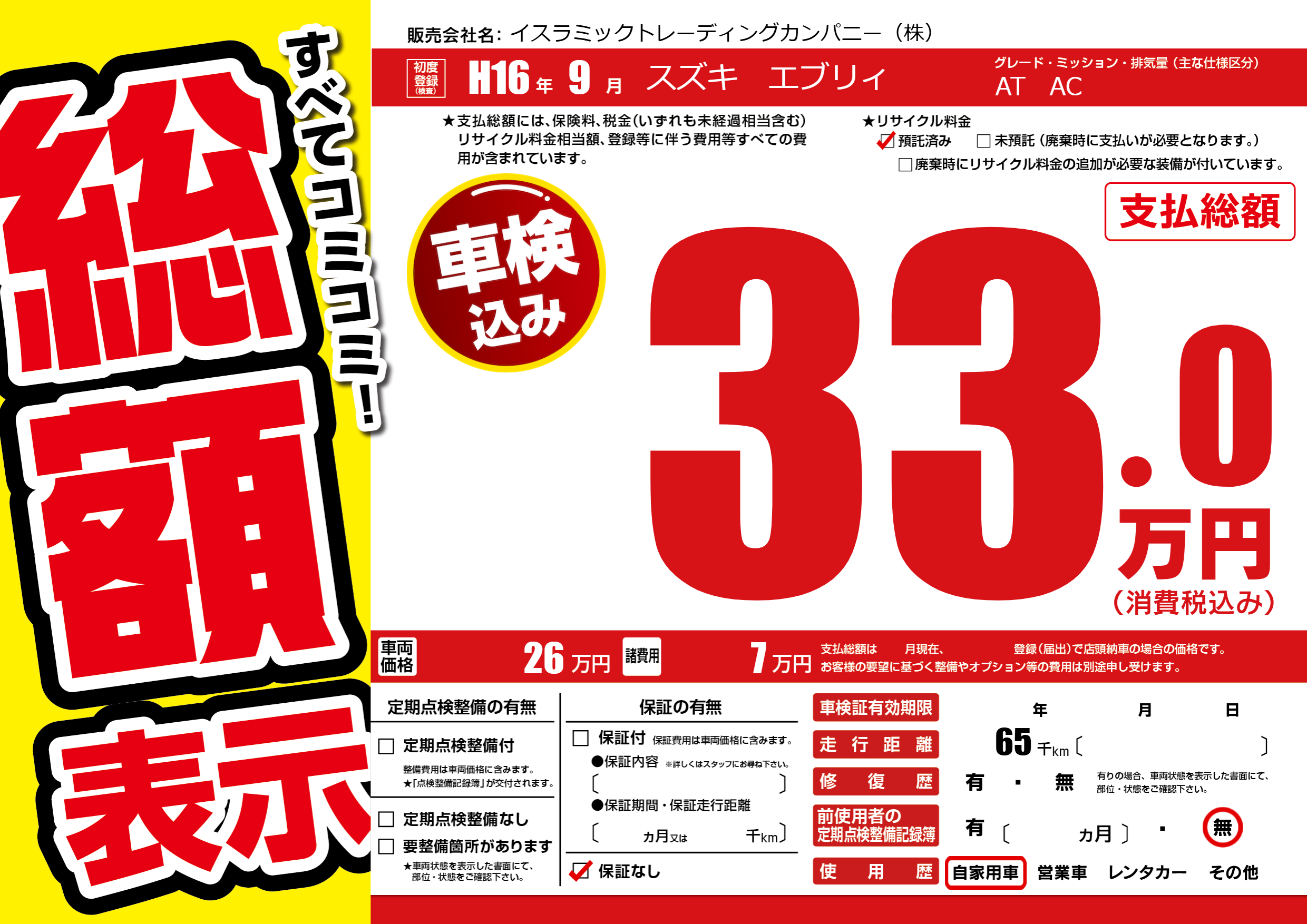 | 車名 | スズキ エブリィ | グレード ミッション 排気量 |