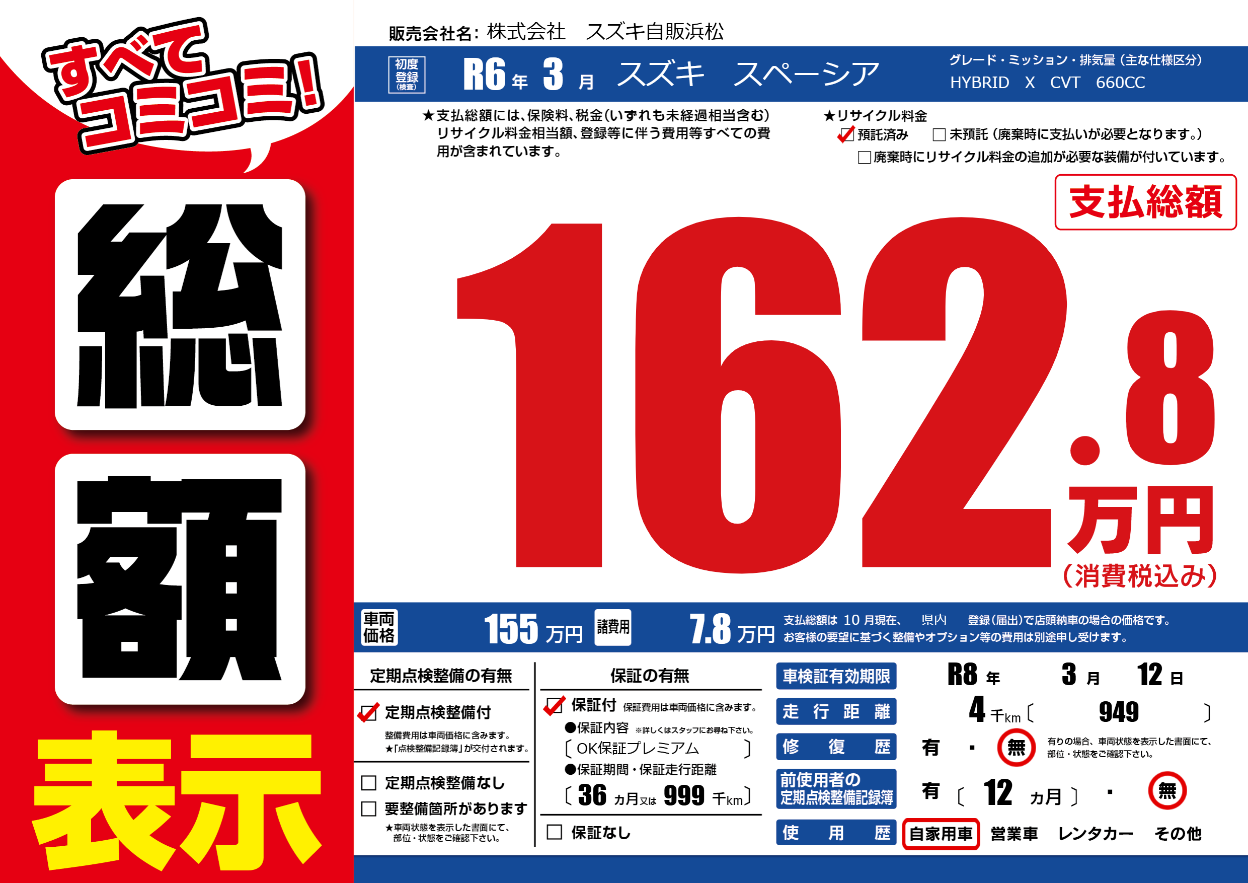 | 車名 | スズキ スペーシア | グレード ミッション 排気量 |