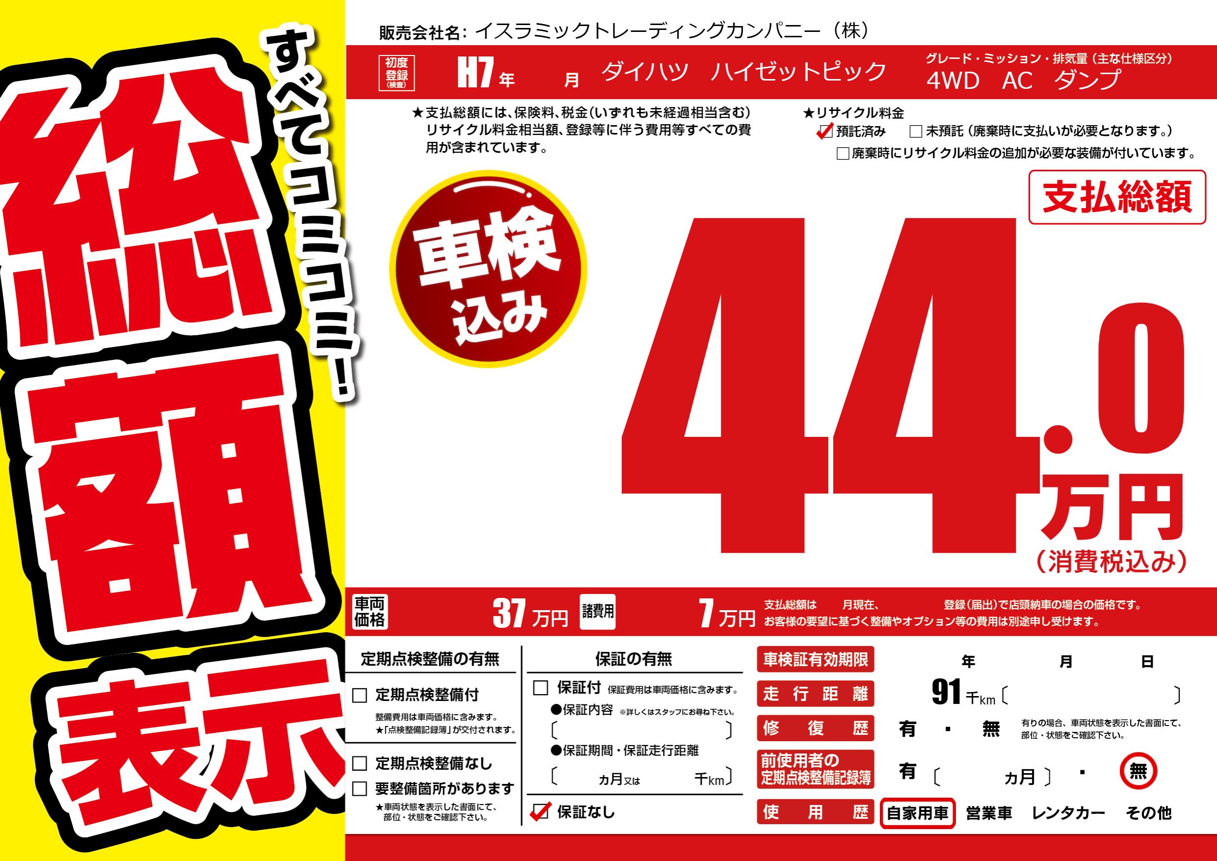 | 車名 | ダイハツ ハイゼットピック | グレード ミッション 排気量 |