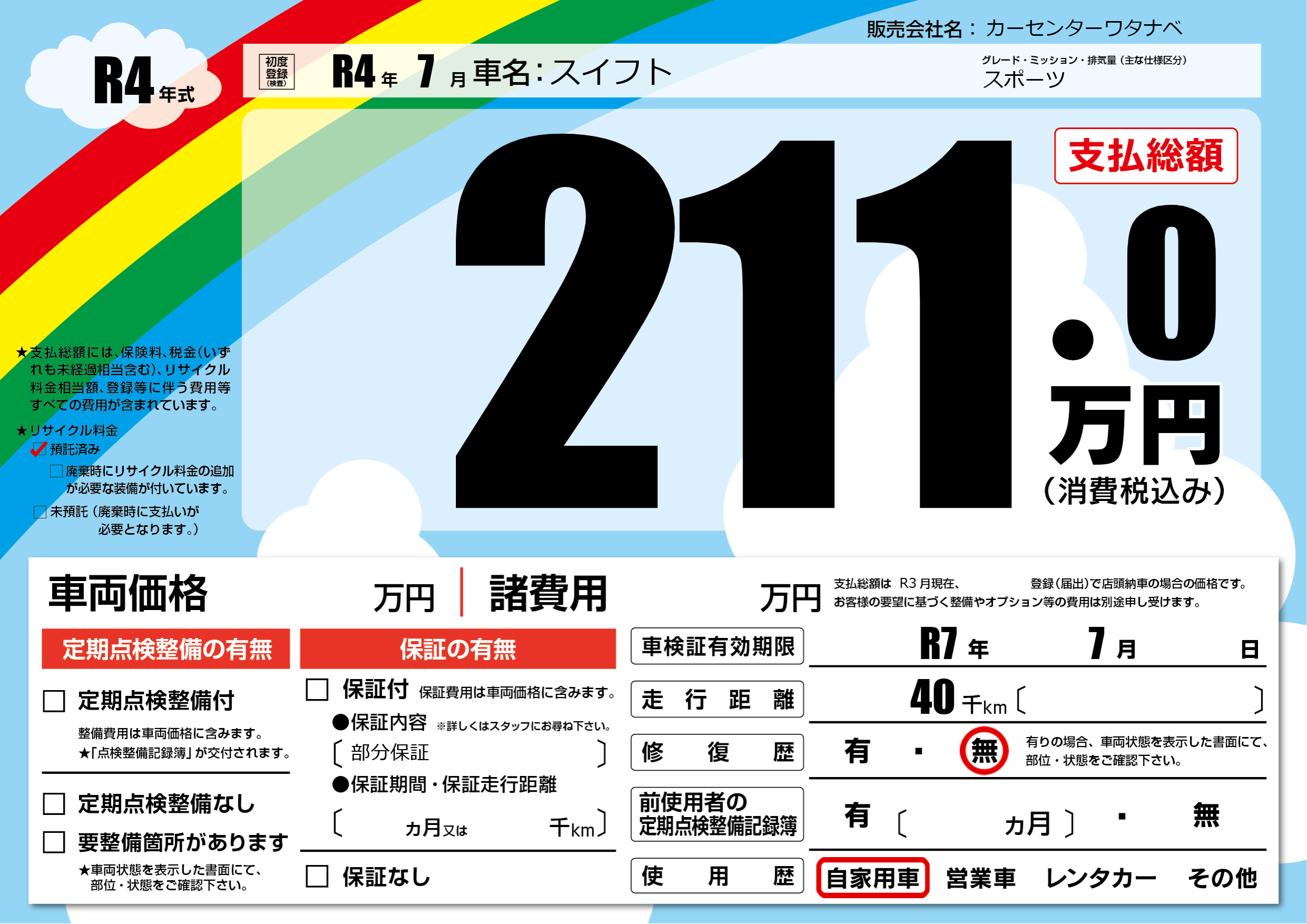 | 走行キロ | 4万km | 初年度登録 | R4年7月 |
