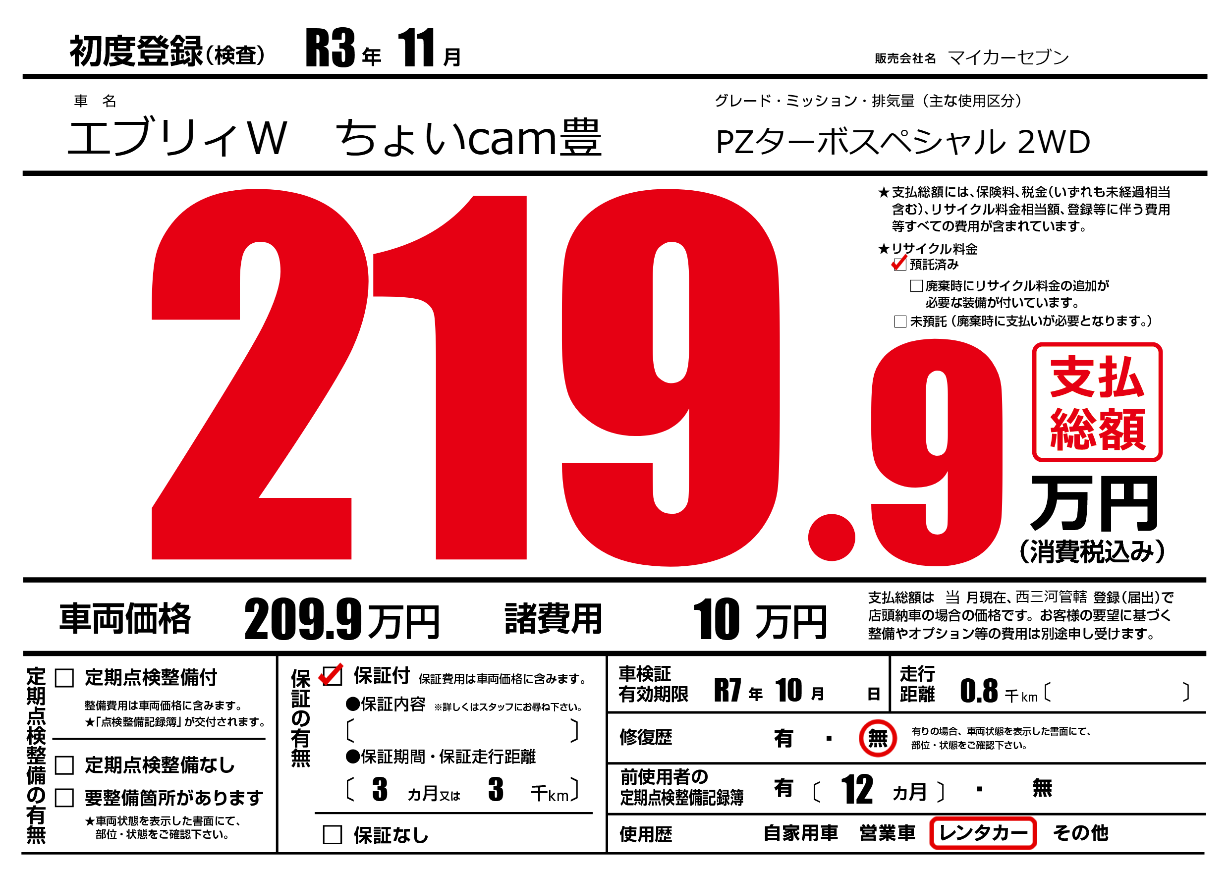 | 車名 | エブリィW ちょいcam豊 | グレード ミッション 排気量 |