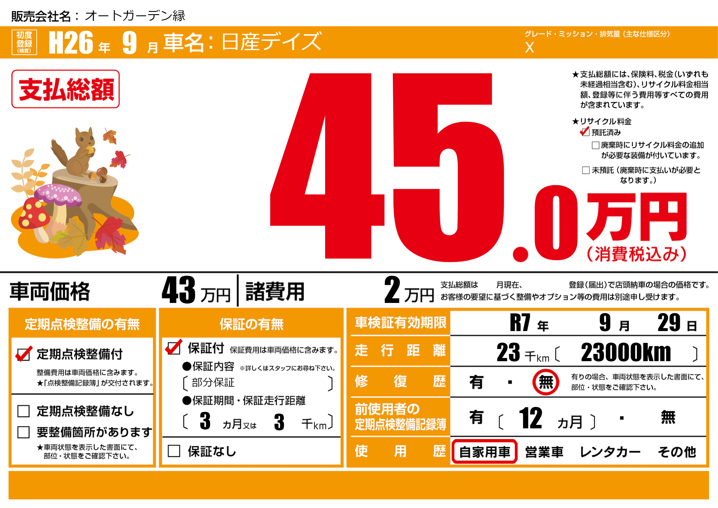 | 車名 | 日産デイズ | グレード ミッション 排気量 |