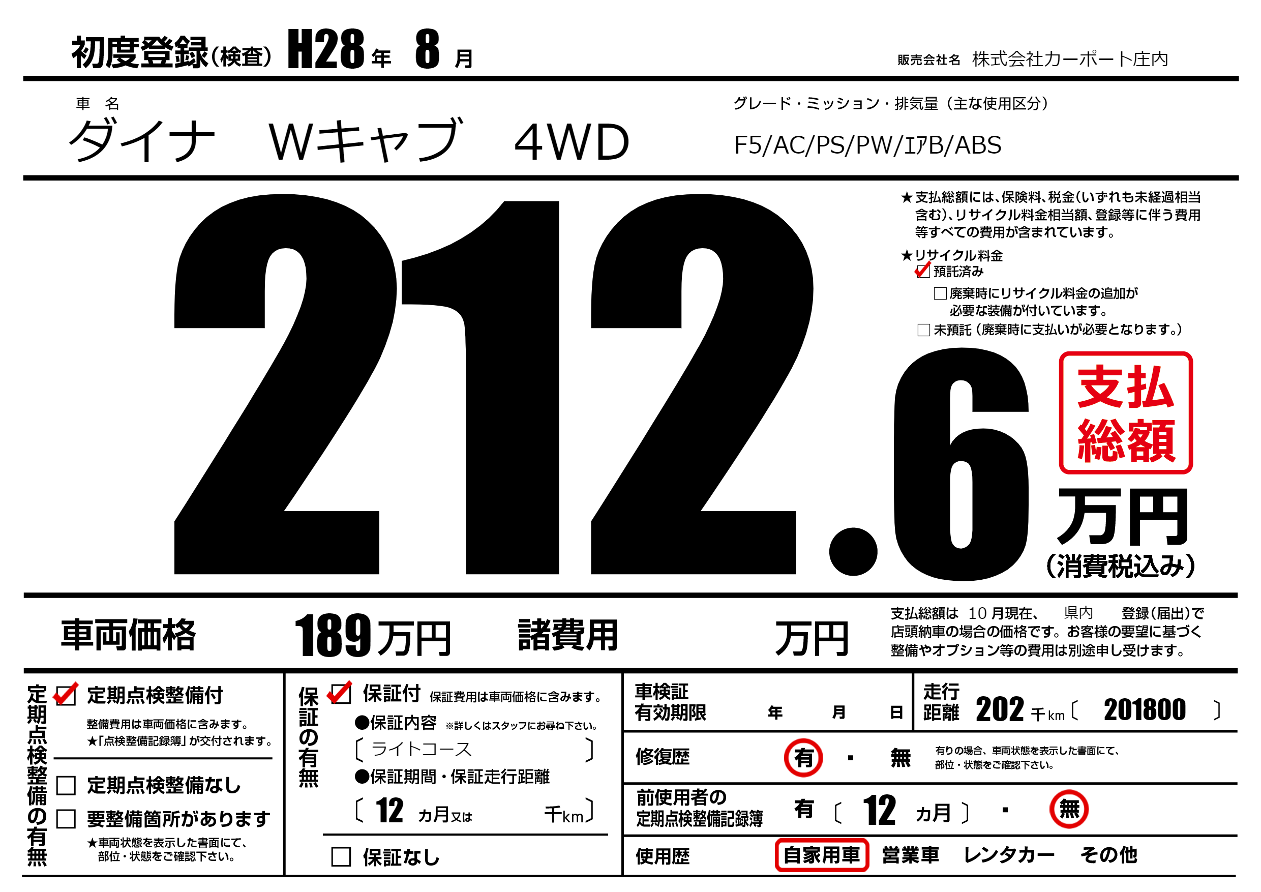 | 走行キロ | 20.2万km | 初年度登録 | H28年8月 |