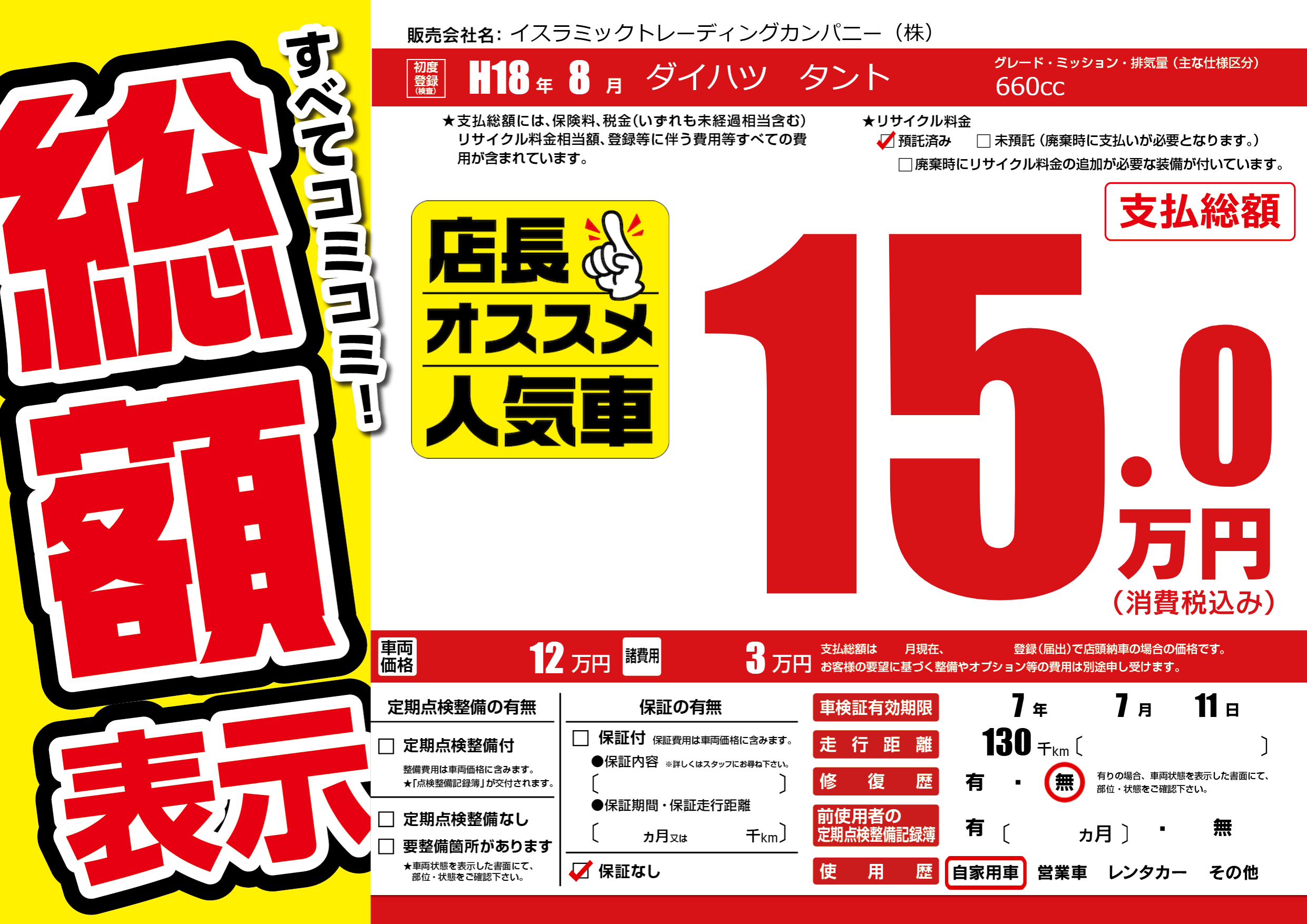| 走行キロ | 13万km | 初年度登録 | H18年8月 |