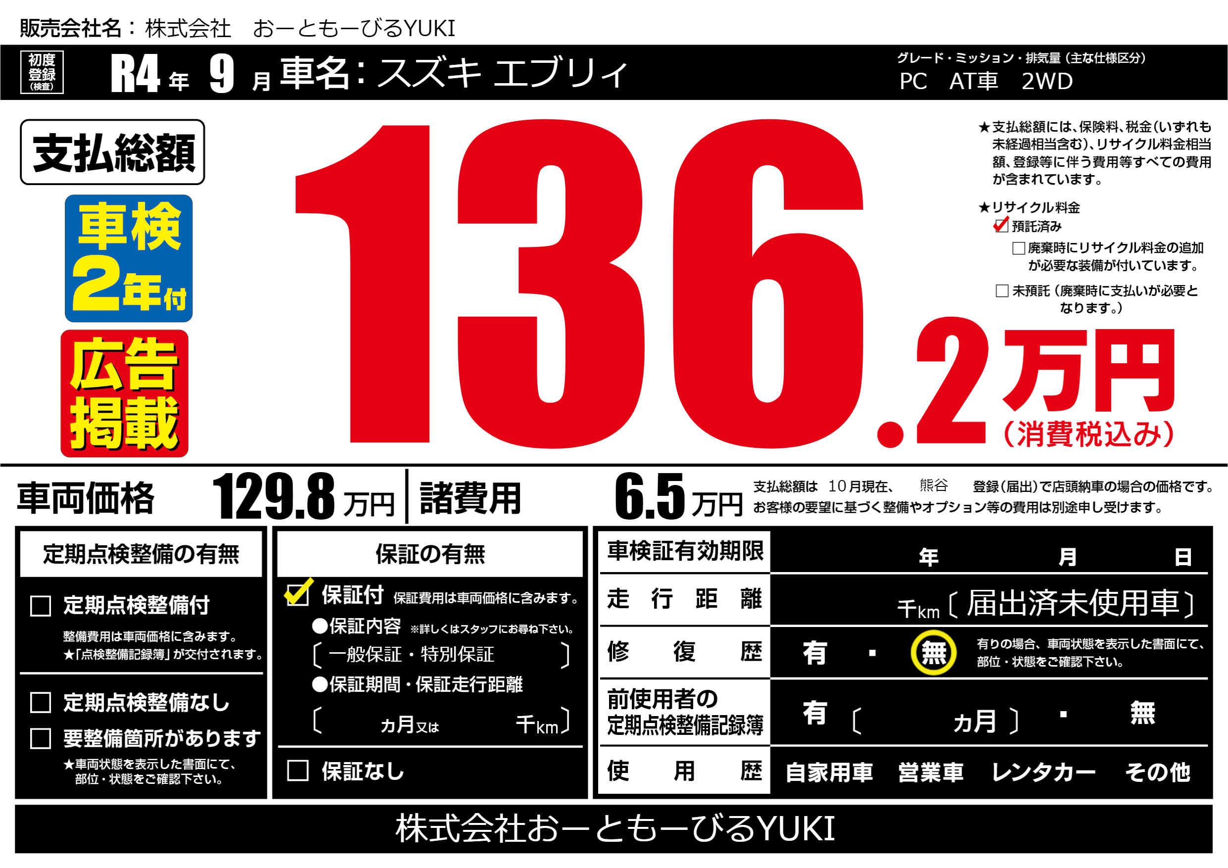 保証付き 保証内容(一般保証・特別保証) ---ヶ月または()千kmまで |