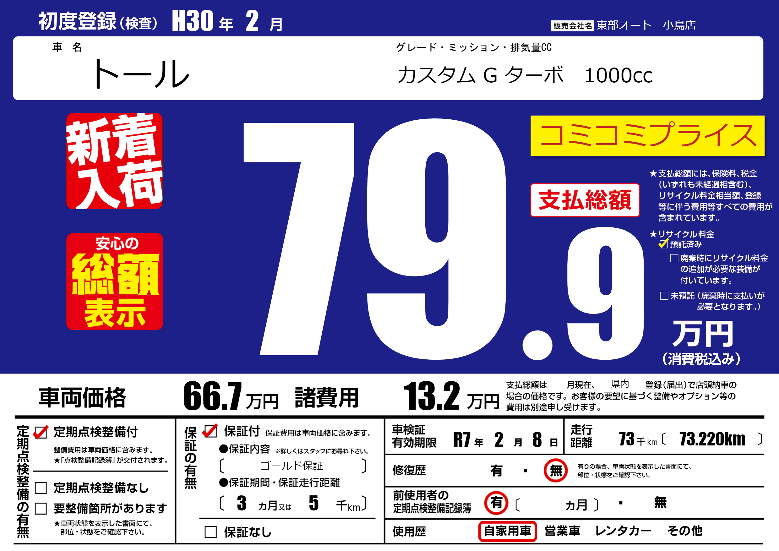 | 車名 | トール | グレード ミッション 排気量 |