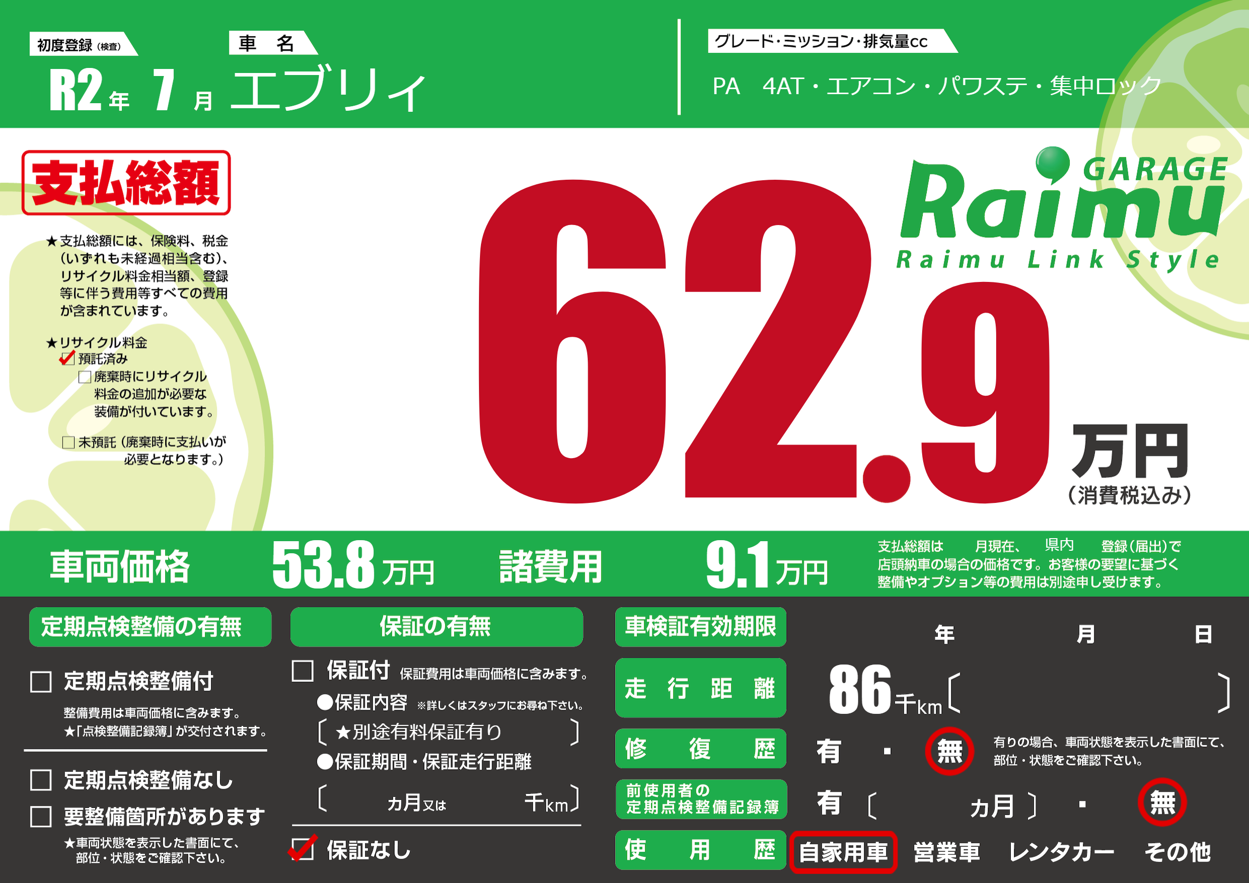 | 車名 | エブリィ | グレード ミッション 排気量 |