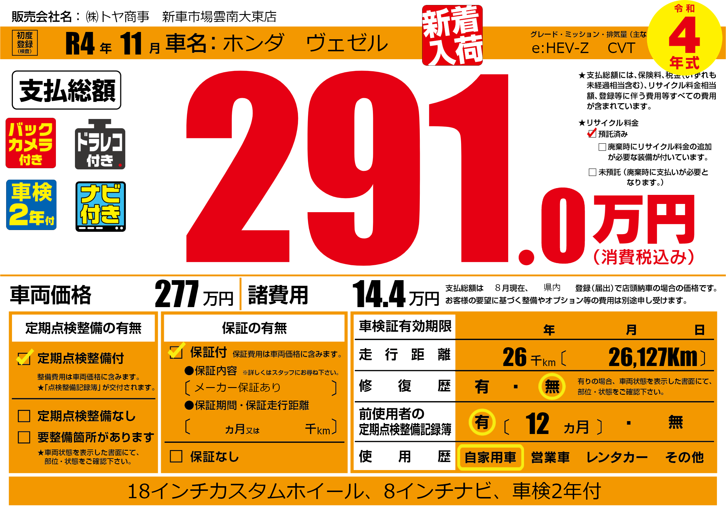 | 車名 | ホンダ ヴェゼル | グレード ミッション 排気量 |