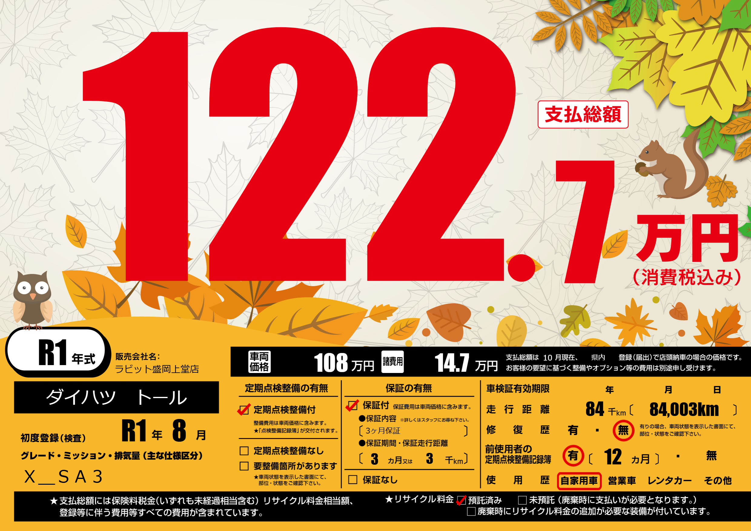 | 車名 | ダイハツ トール | グレード ミッション 排気量 |