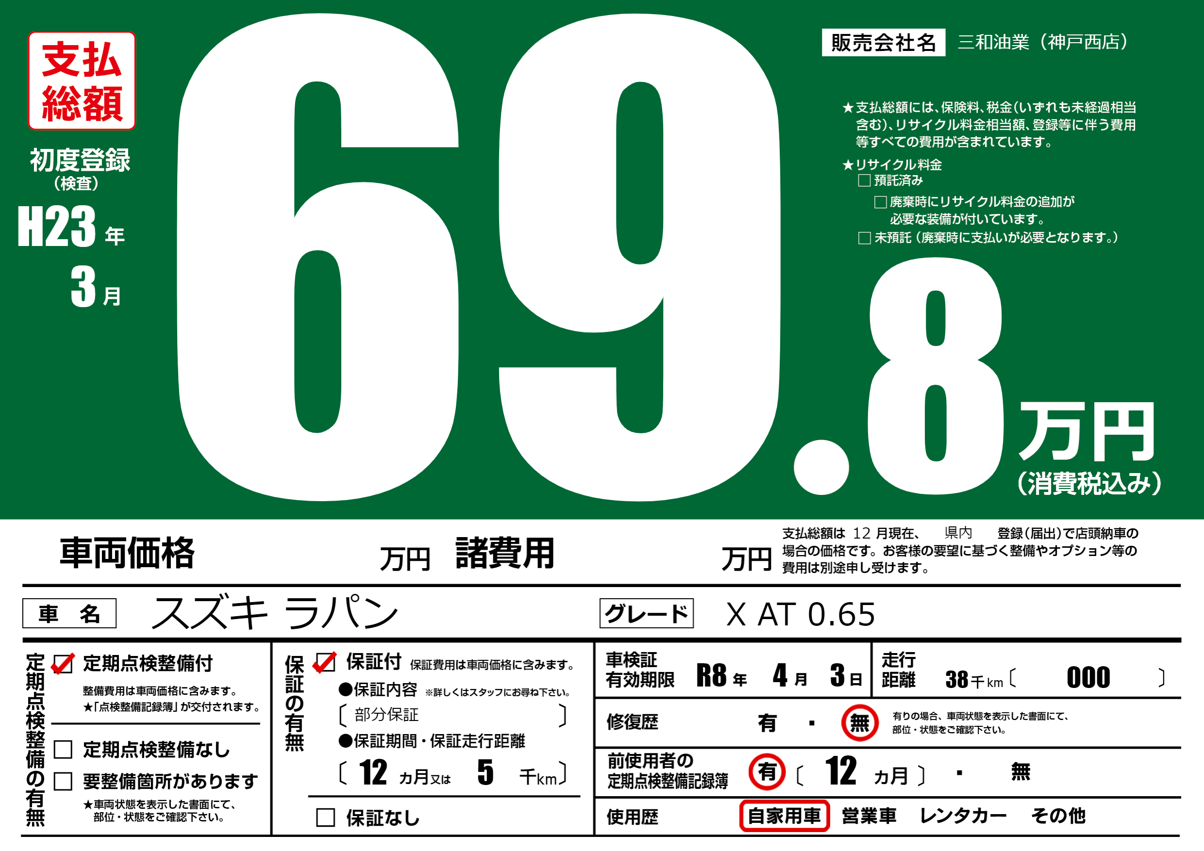| 走行キロ | 3.8万km | 初年度登録 | H23年3月 |