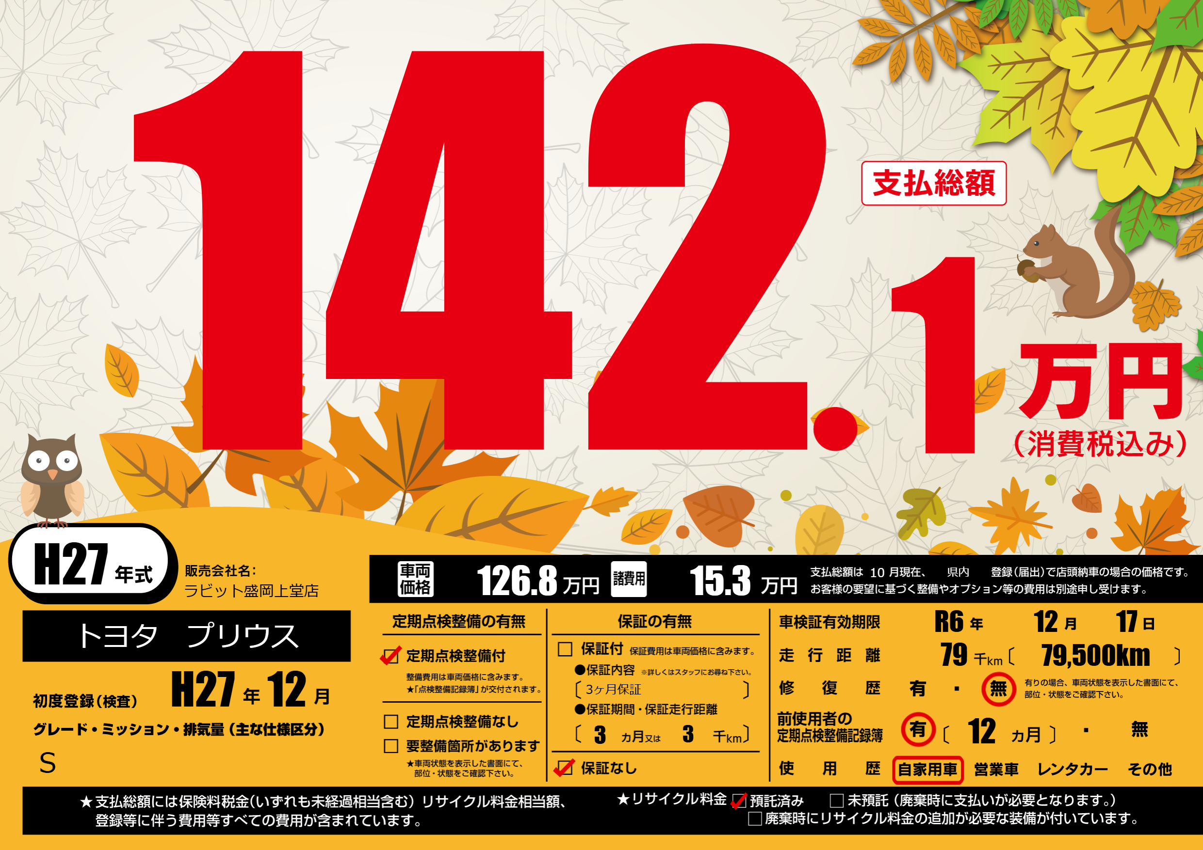 | 車名 | トヨタ プリウス | グレード ミッション 排気量 |