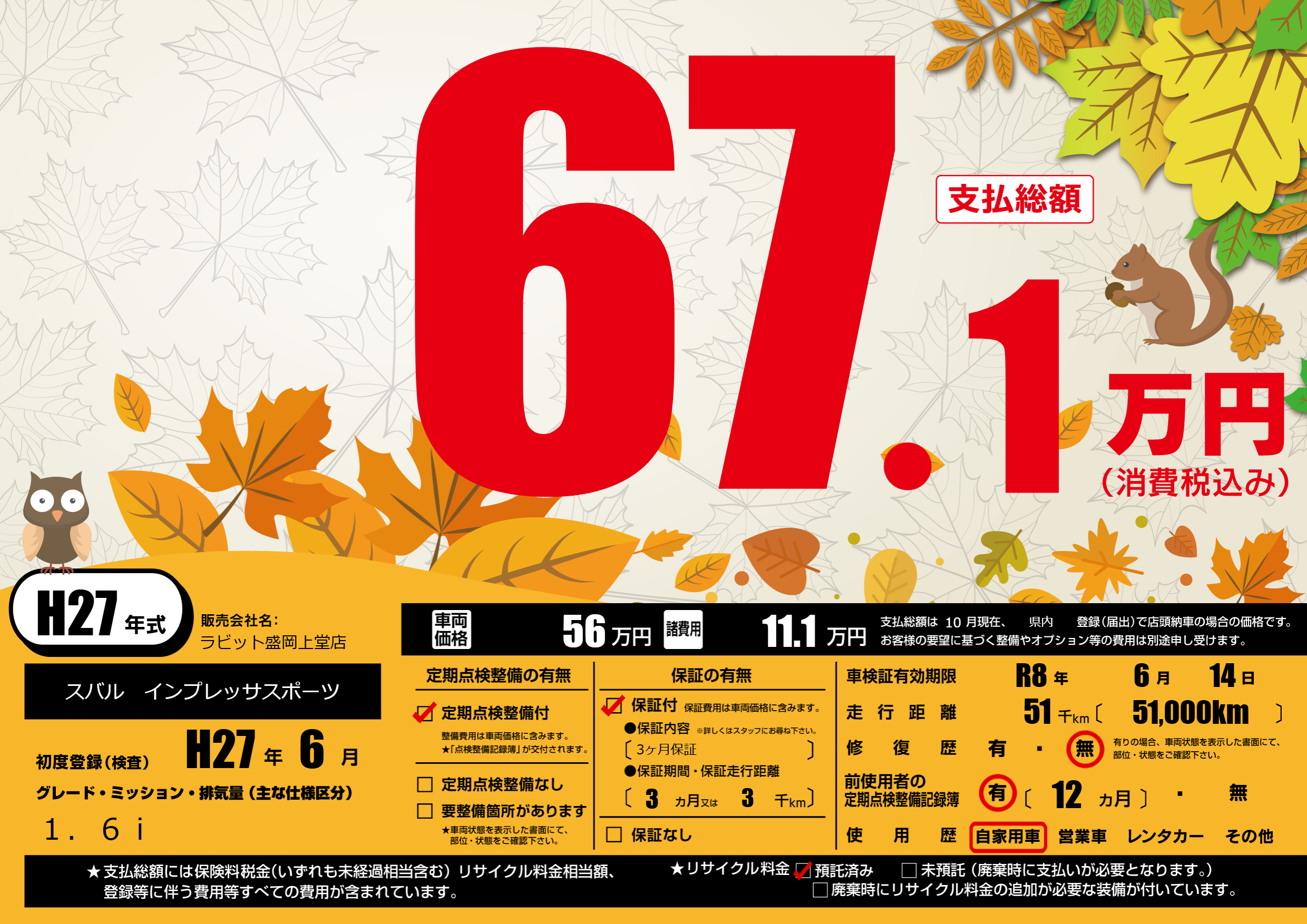 | 走行キロ | 5.1万km | 初年度登録 | H27年6月 |