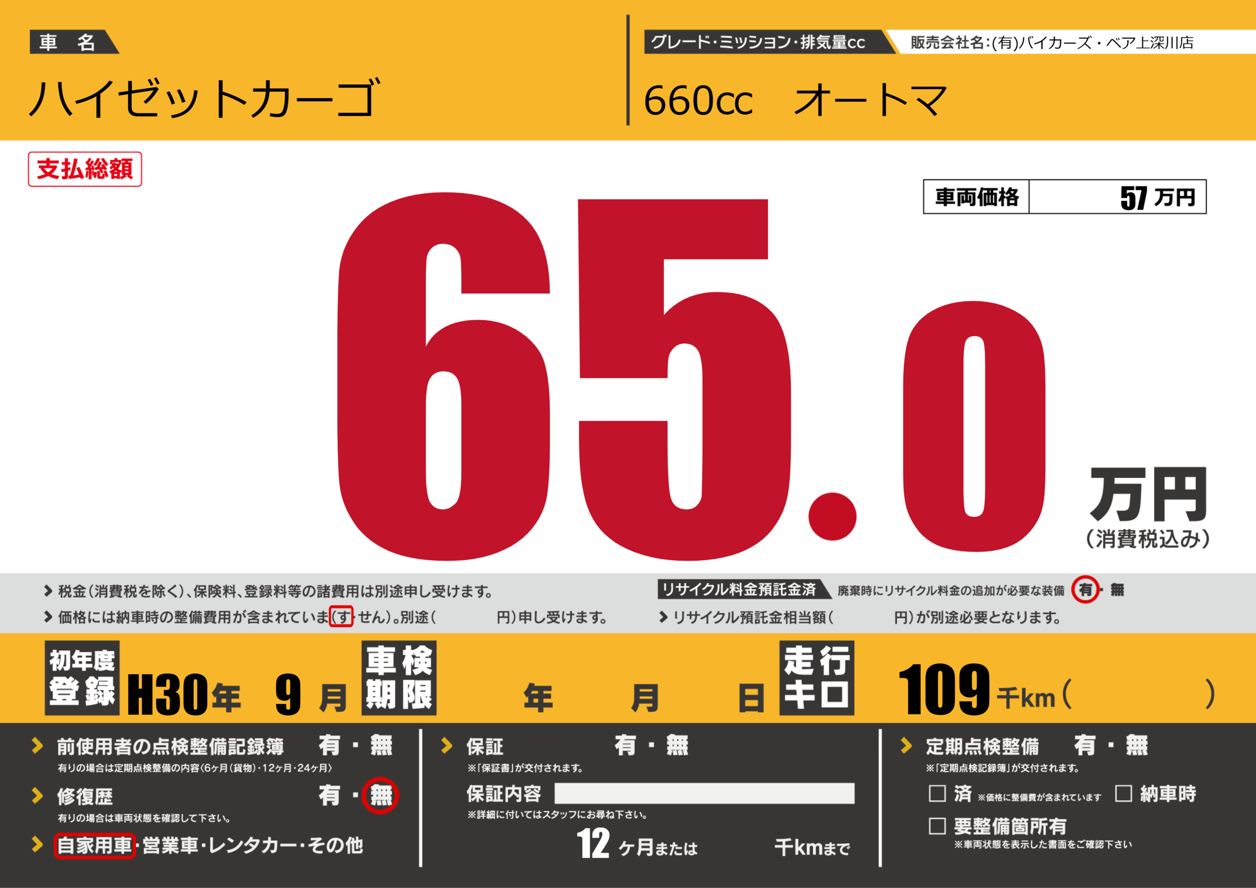 保証なし 保証内容(---) 12ヶ月または()千kmまで |