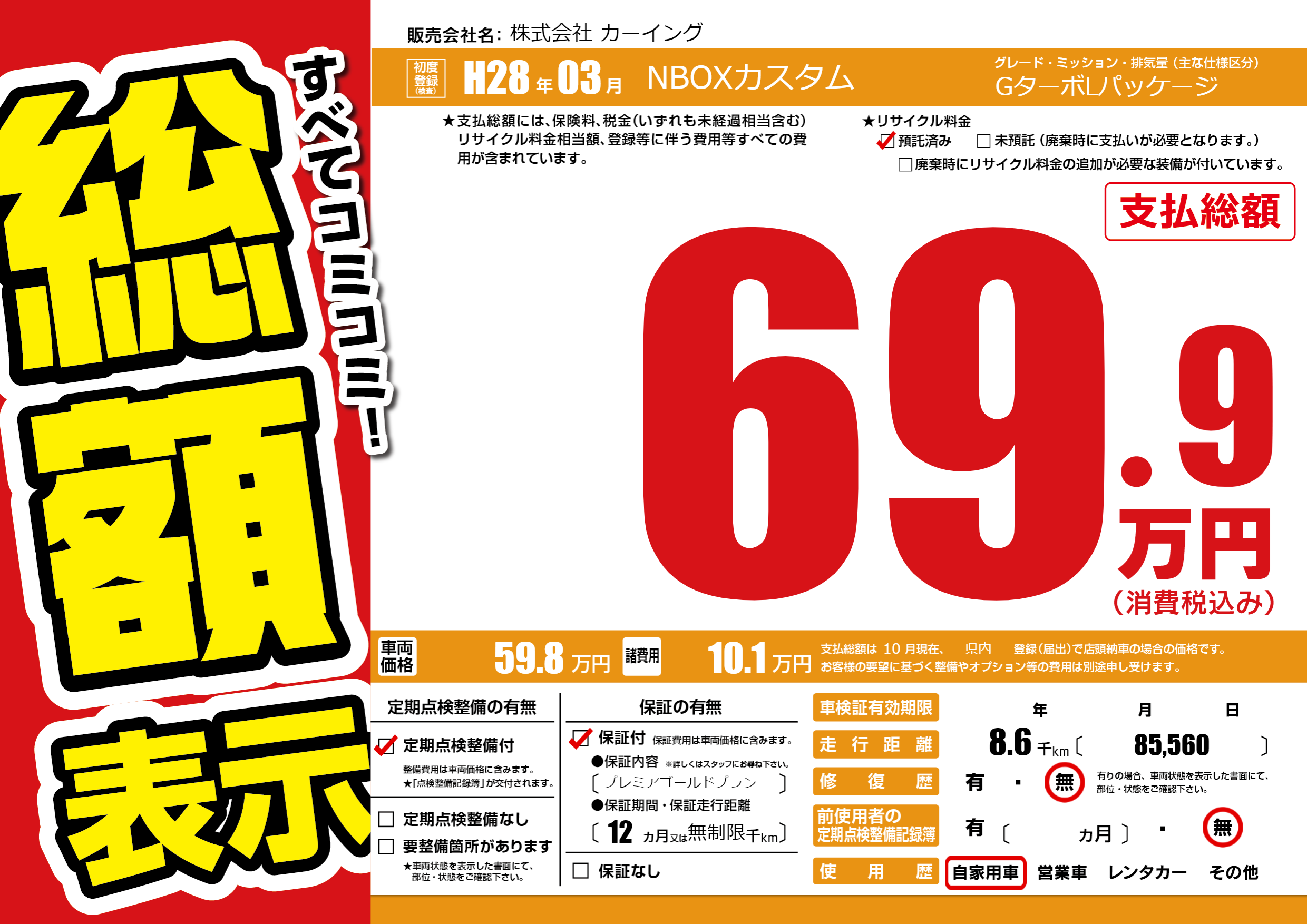 | 車名 | NBOXカスタム | グレード ミッション 排気量 |