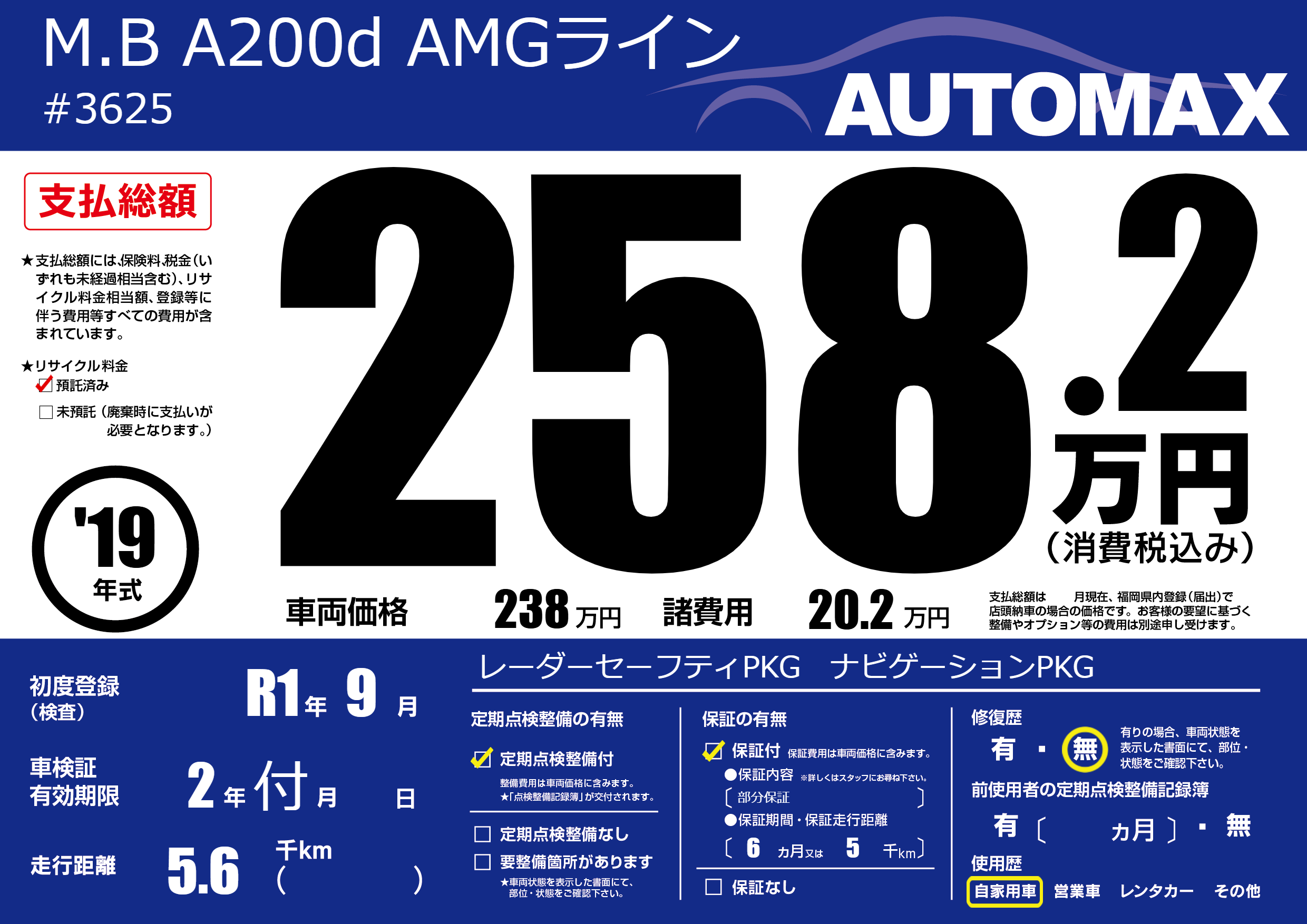 | 車名 | M.B A200d AMGライン | グレード ミッション 排気量 |