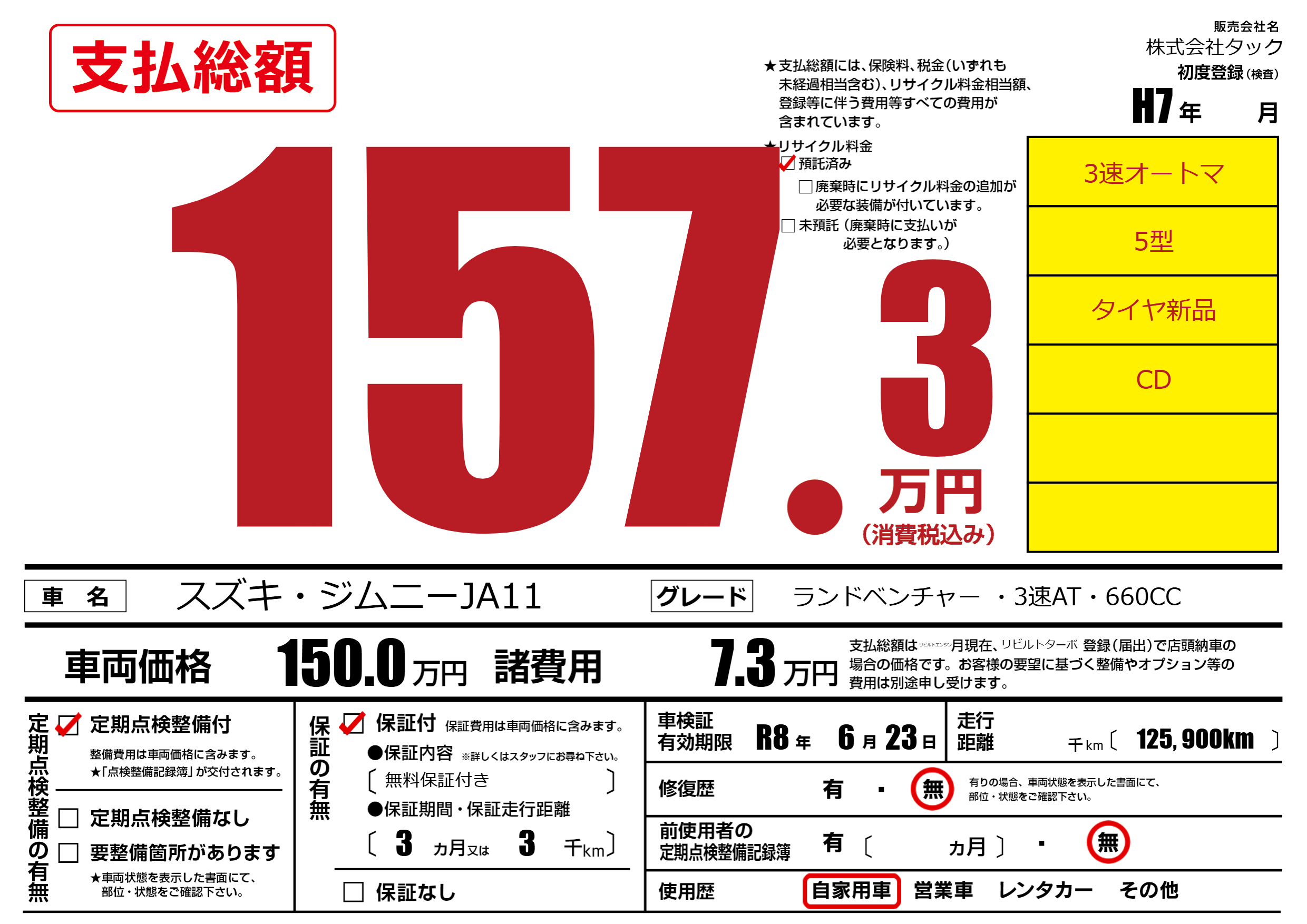 | 車名 | スズキ・ジムニーJA11 | グレード ミッション 排気量 |