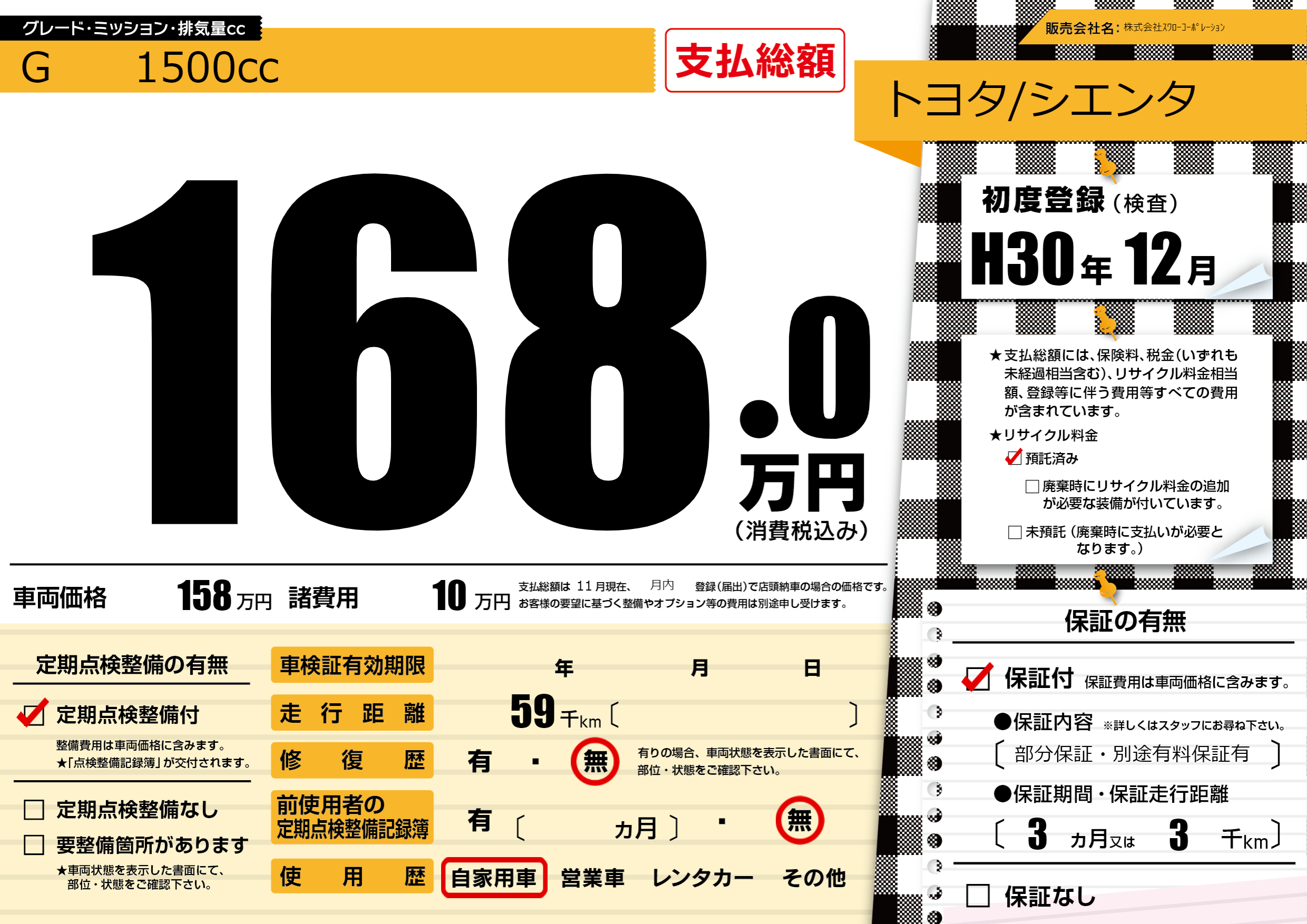 | 車名 | トヨタ/シエンタ | グレード ミッション 排気量 |