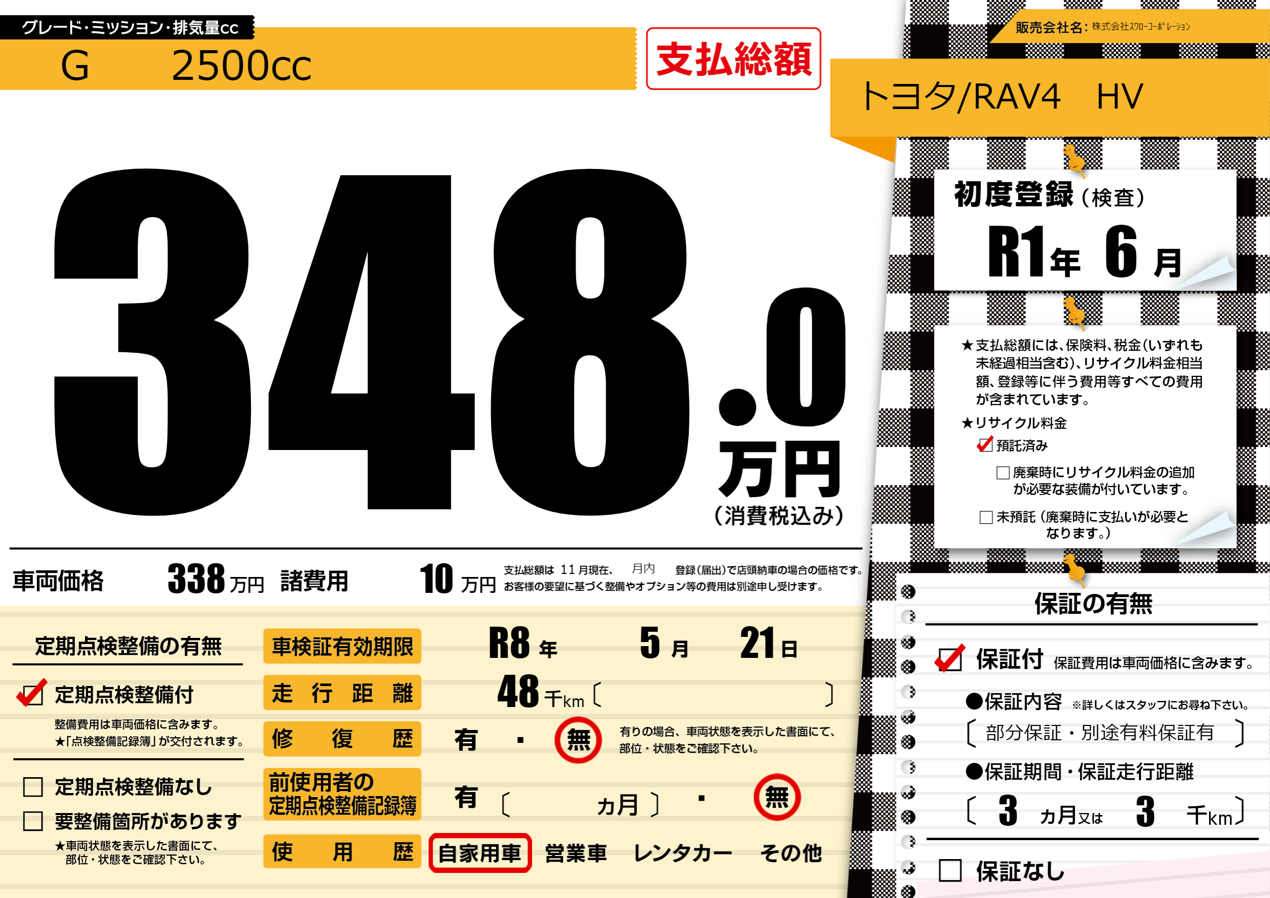 | 車名 | トヨタ/RAV4 HV | グレード ミッション 排気量 |