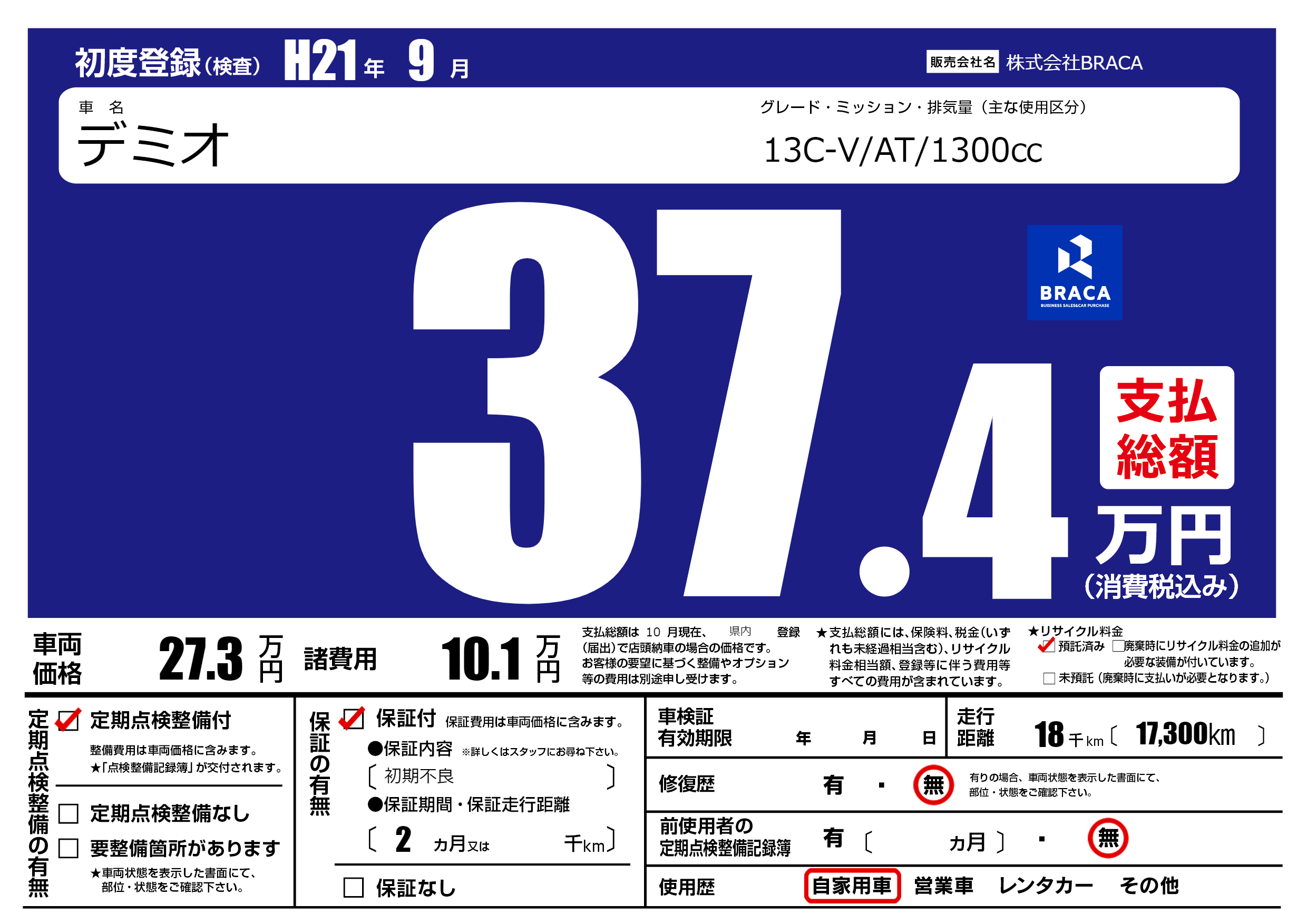 | 車名 | デミオ | グレード ミッション 排気量 |