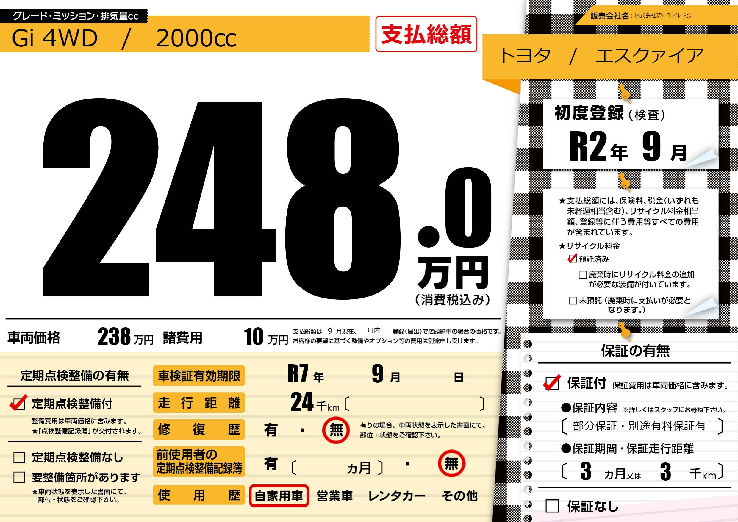 | 走行キロ | 2.4万km | 初年度登録 | R2年9月 |