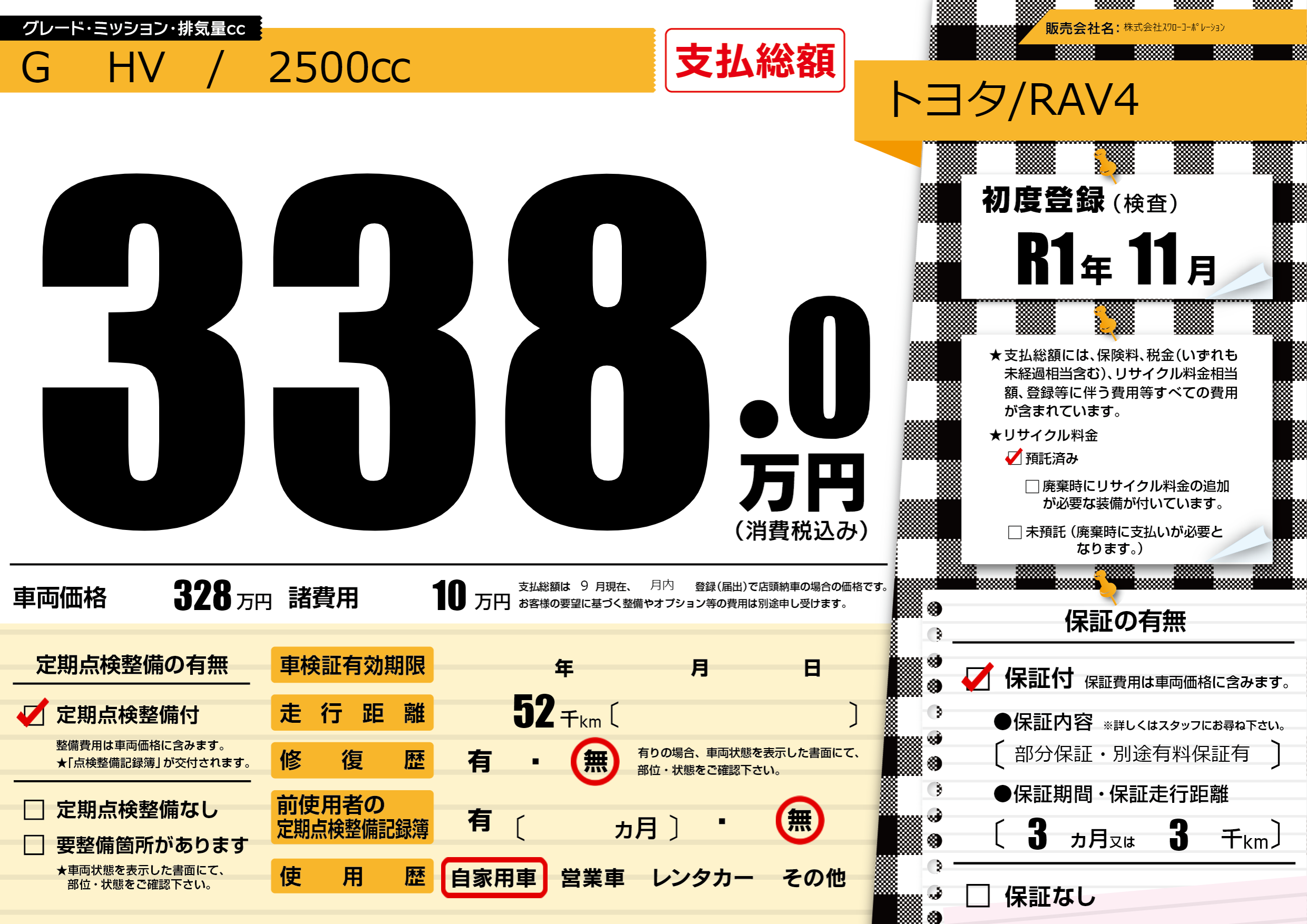 | 車名 | トヨタ/RAV4 | グレード ミッション 排気量 |
