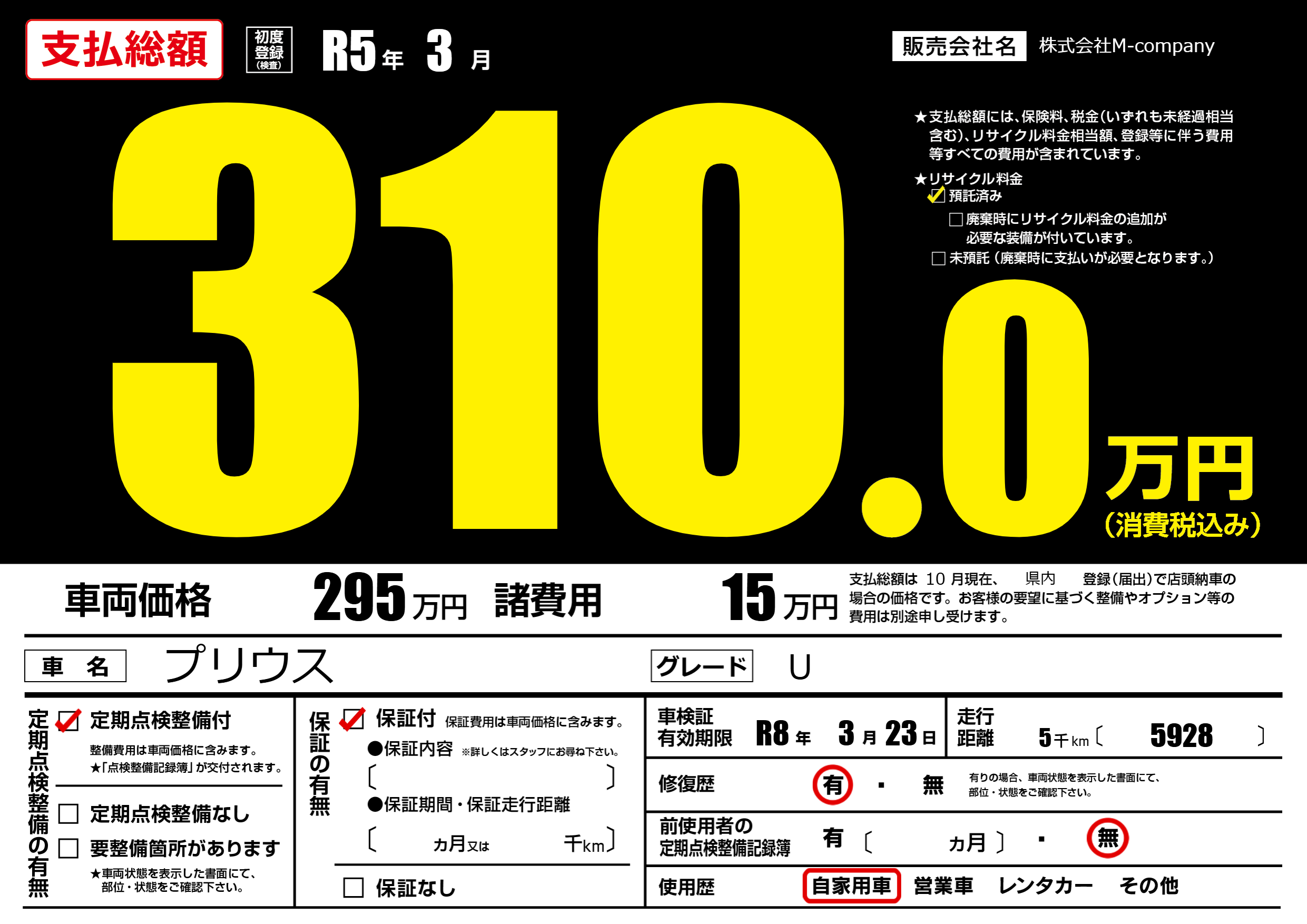 | 走行キロ | 0.5万km | 初年度登録 | R5年3月 |
