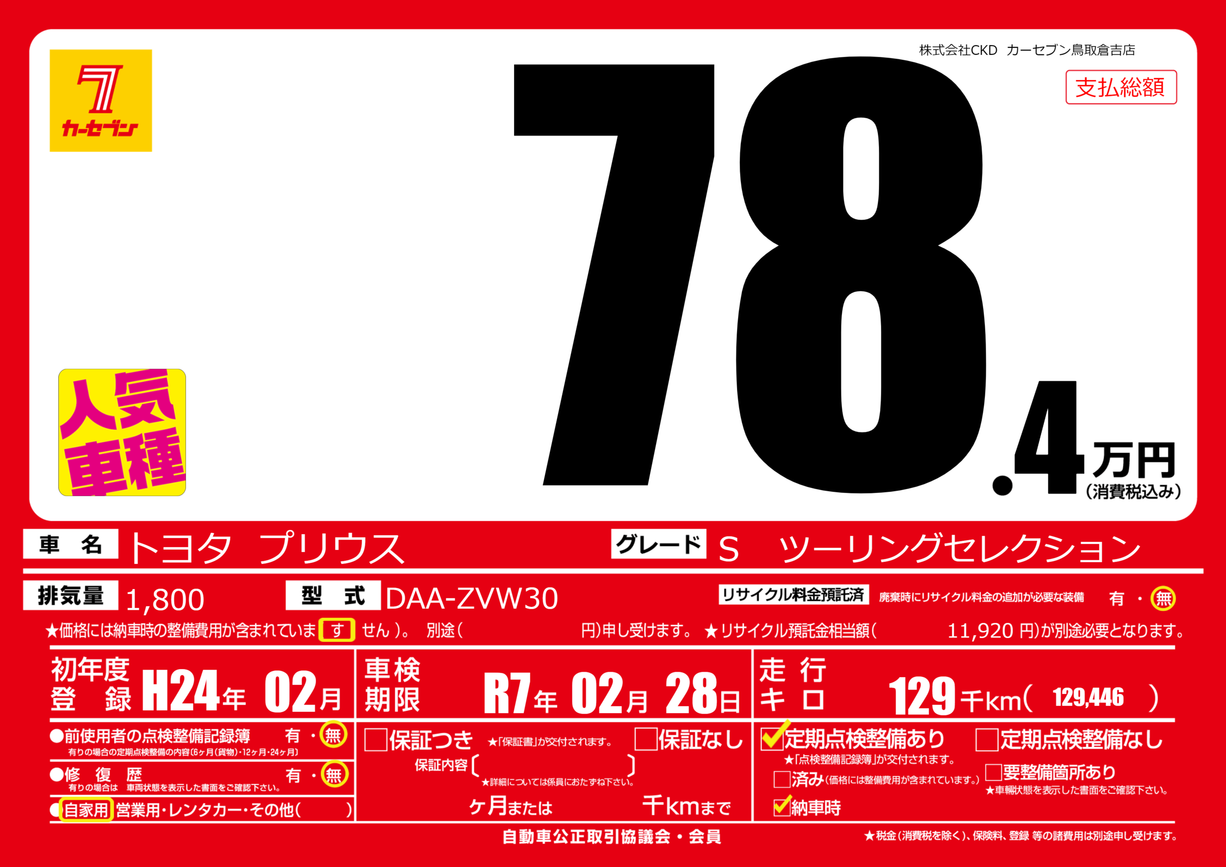 | 走行キロ | 12.9万km | 初年度登録 | H24年02月 |