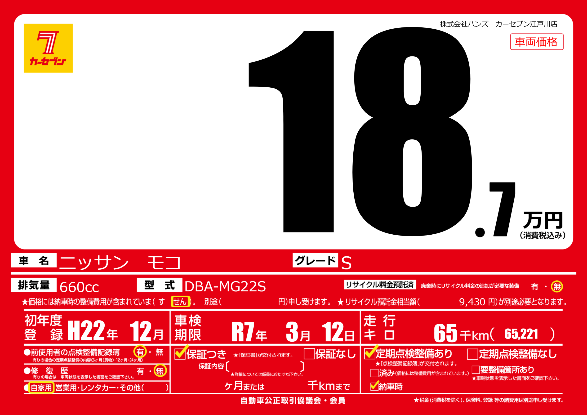 | 車名 | ニッサン モコ | グレード ミッション 排気量 |